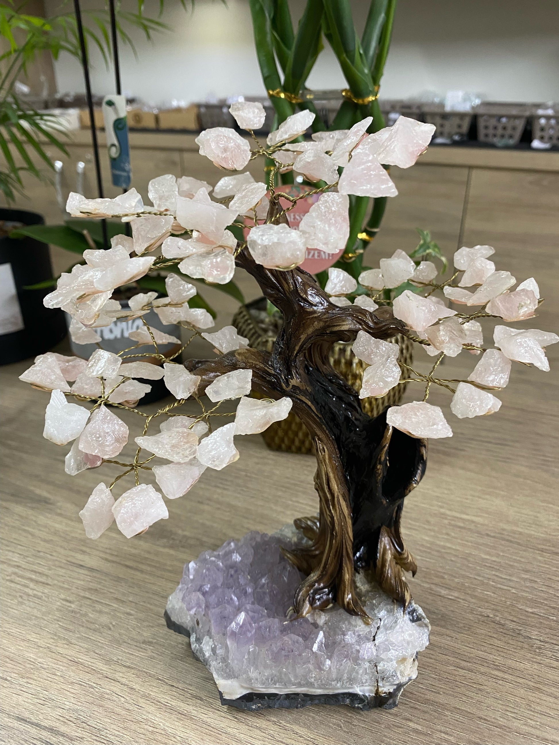 Conecte-se com as energias vibrantes da natureza com a nossa Árvore de Pedras, uma obra única e encantadora que combina uma base de Ametista com pétalas de quartzo rosa.