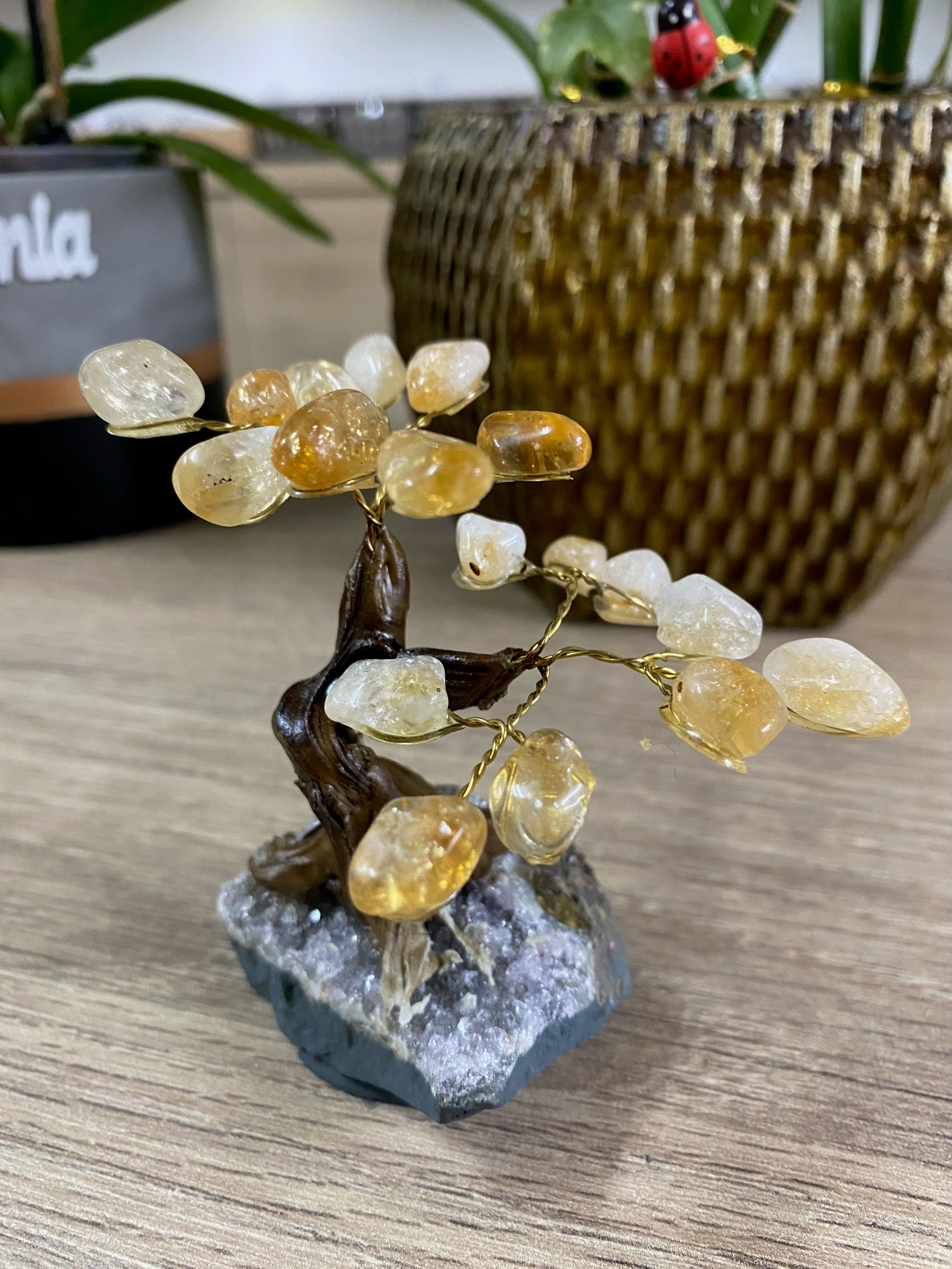 Conecte-se com as energias vibrantes da natureza com a nossa Árvore de Pedras, uma obra única e encantadora que combina uma base de ametista com pétalas de citrino.
