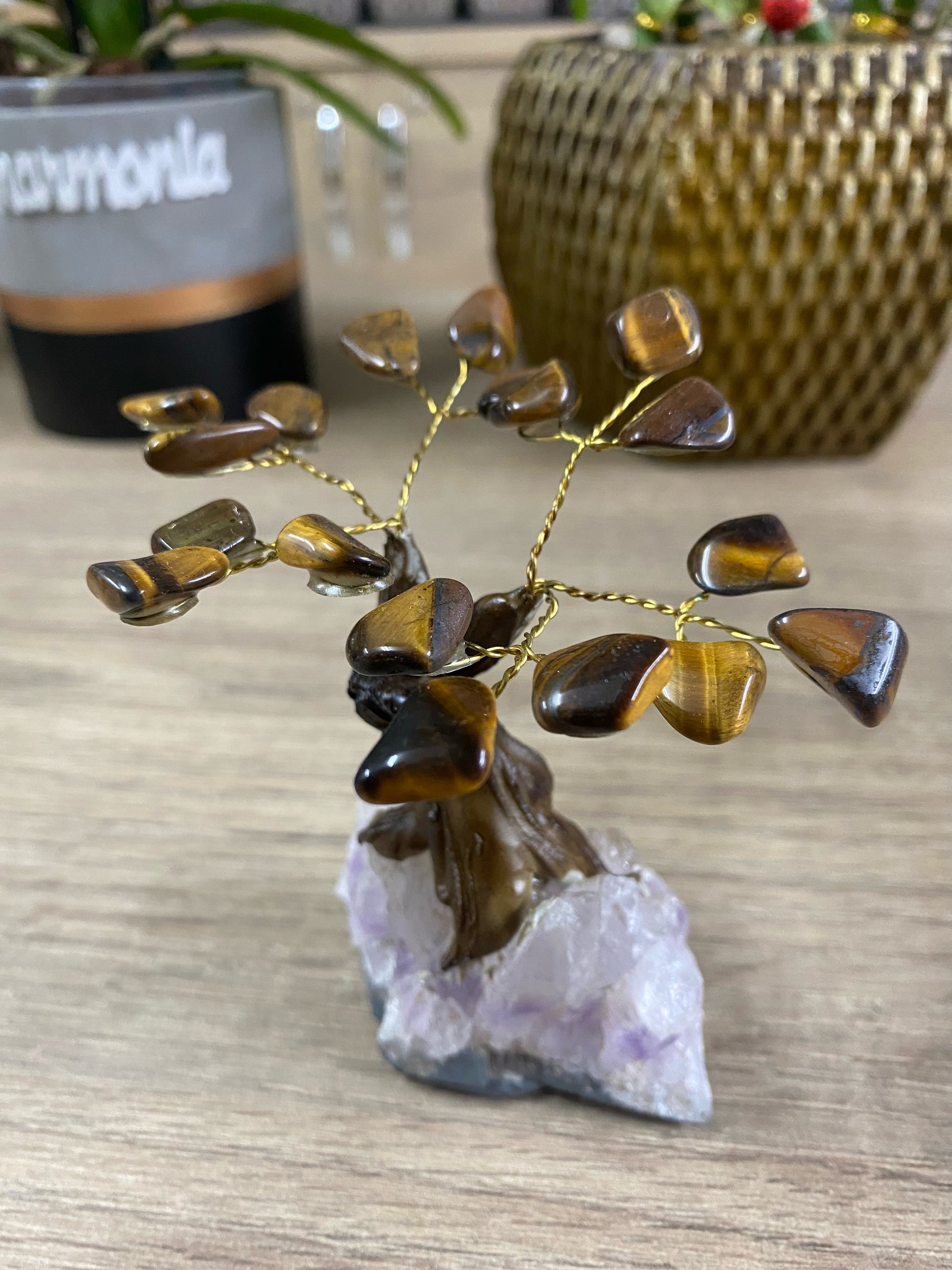 Conecte-se com as energias vibrantes da natureza com a nossa Árvore de Pedras, uma obra única e encantadora que combina uma base de ametista com pétalas de olho de tigre.