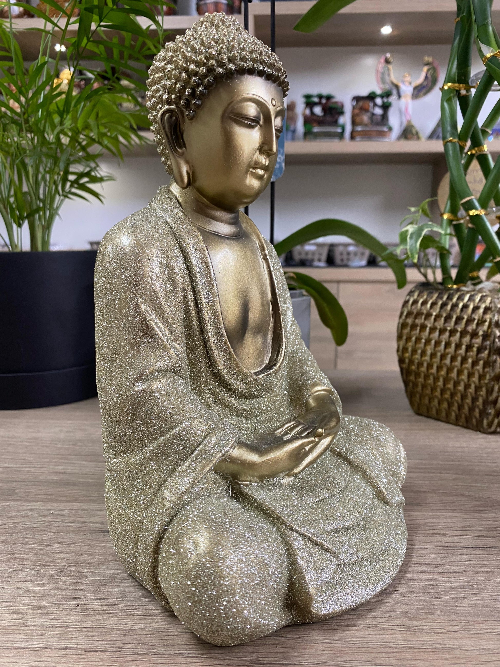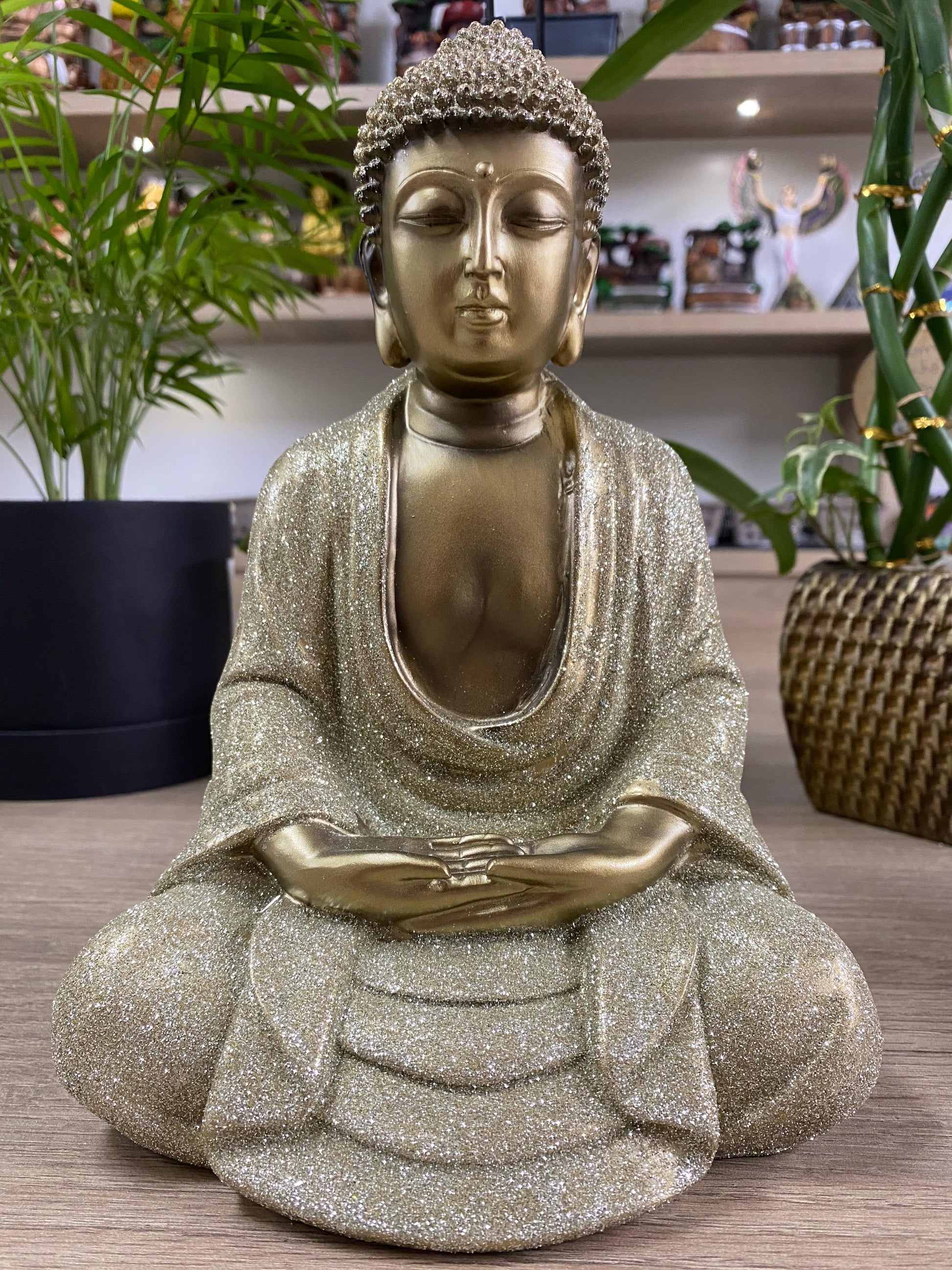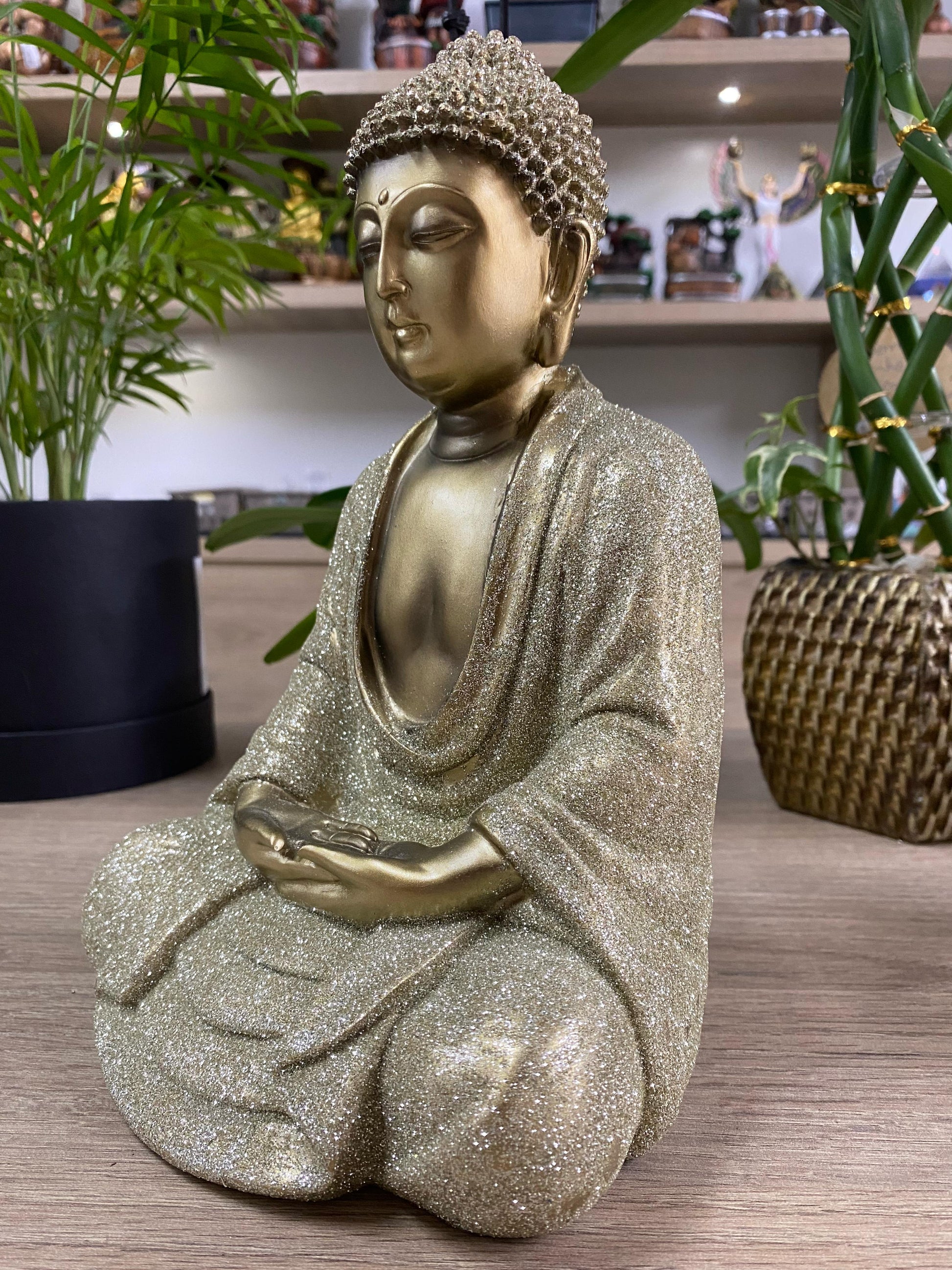 Apresentamos o Buda Dourado com Brilho, uma escultura em resina que captura a serenidade e sabedoria do Buda em uma pose de meditação. Esta peça não apenas adiciona um toque de elegância ao seu espaço, mas também representa a busca pela paz interior e iluminação.