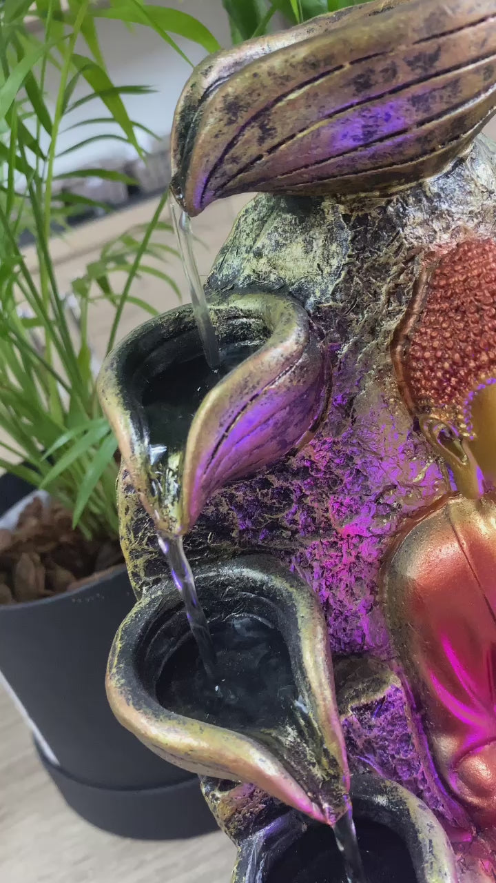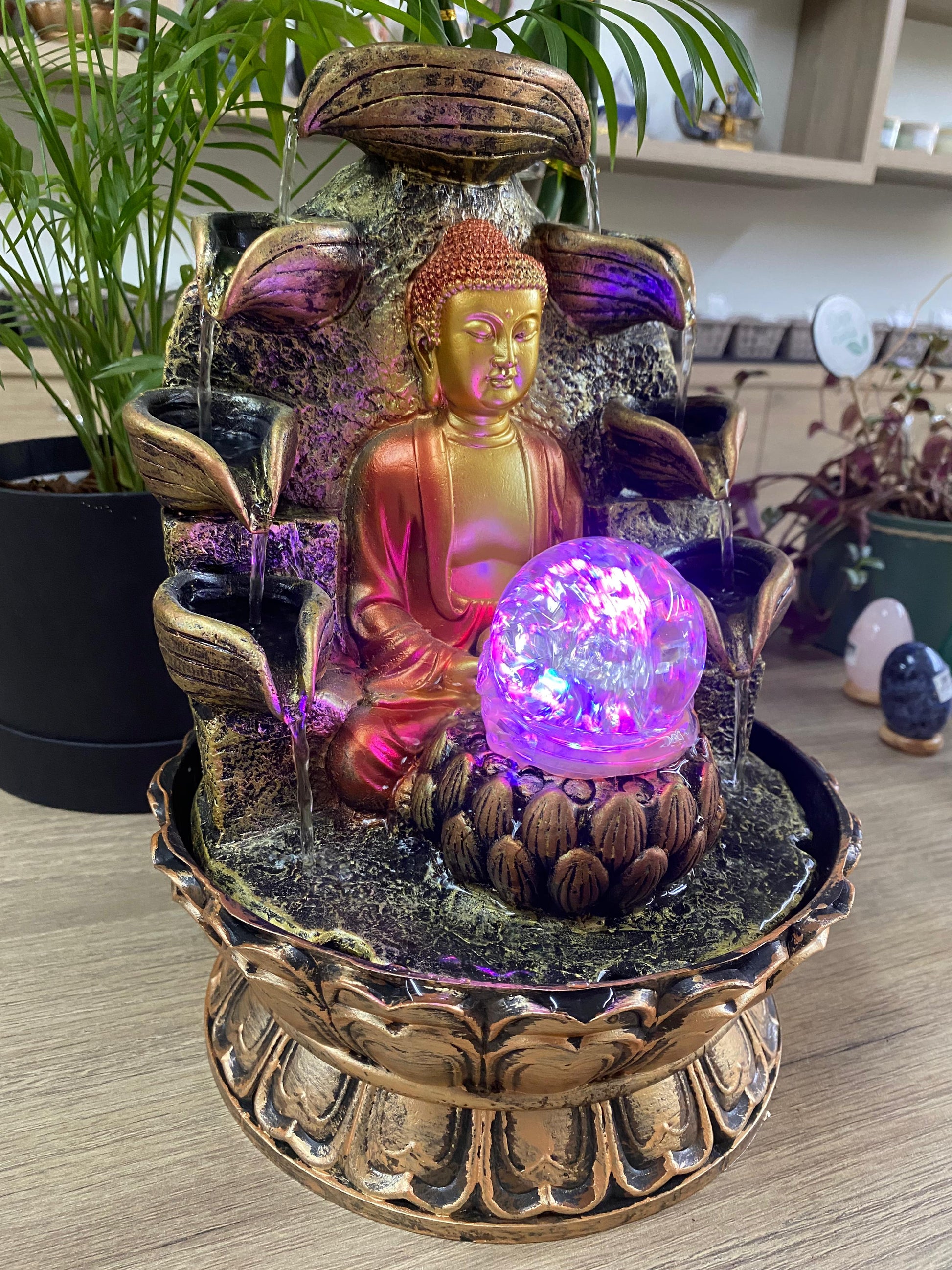 - O Buda, símbolo de paz e elevação espiritual, é delicadamente esculpido na fonte, transmitindo uma presença tranquila e inspiradora.