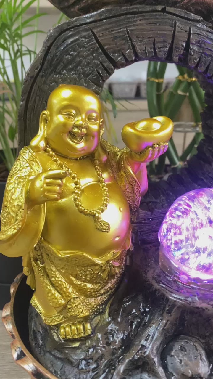 - O Buda, símbolo de paz e elevação espiritual, é delicadamente esculpido na fonte, transmitindo uma presença tranquila e inspiradora.