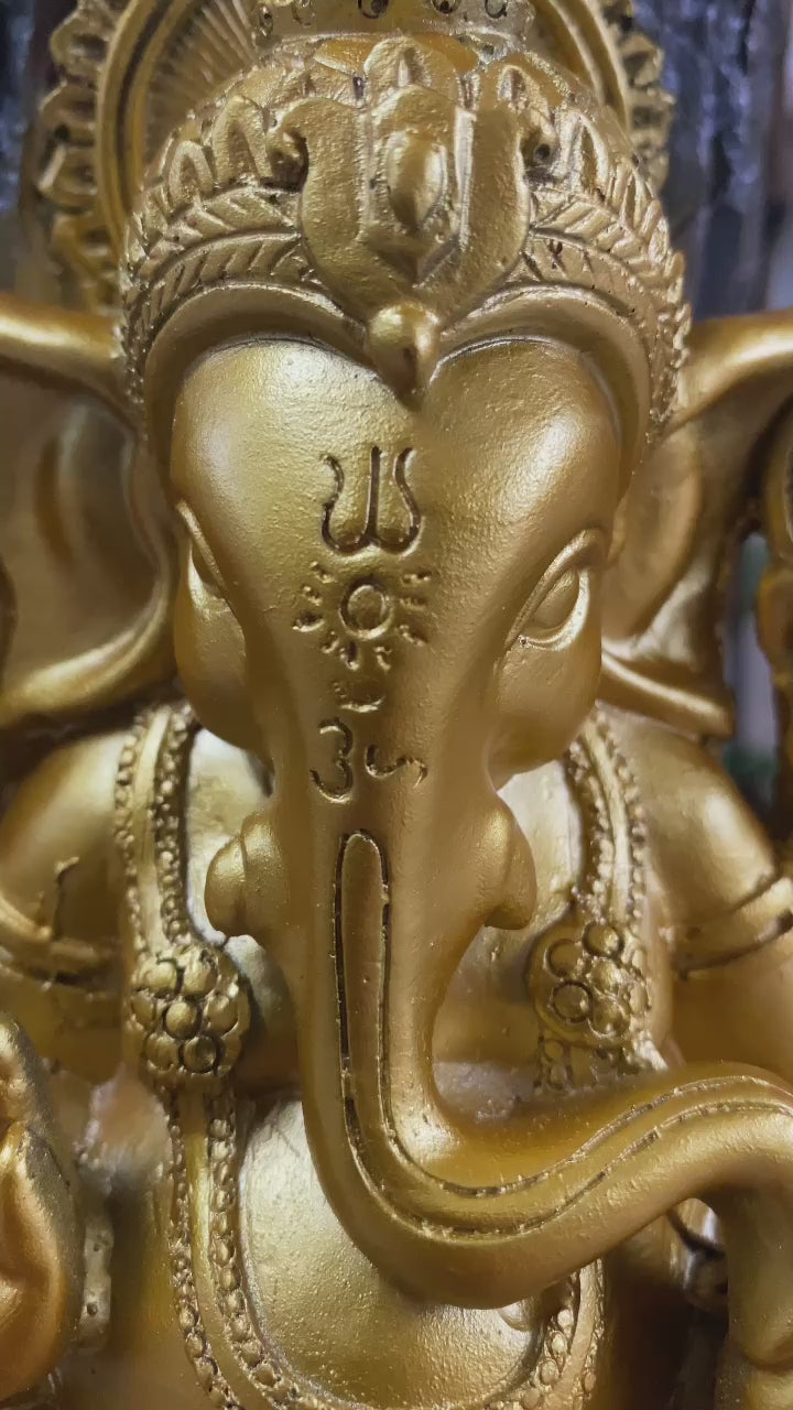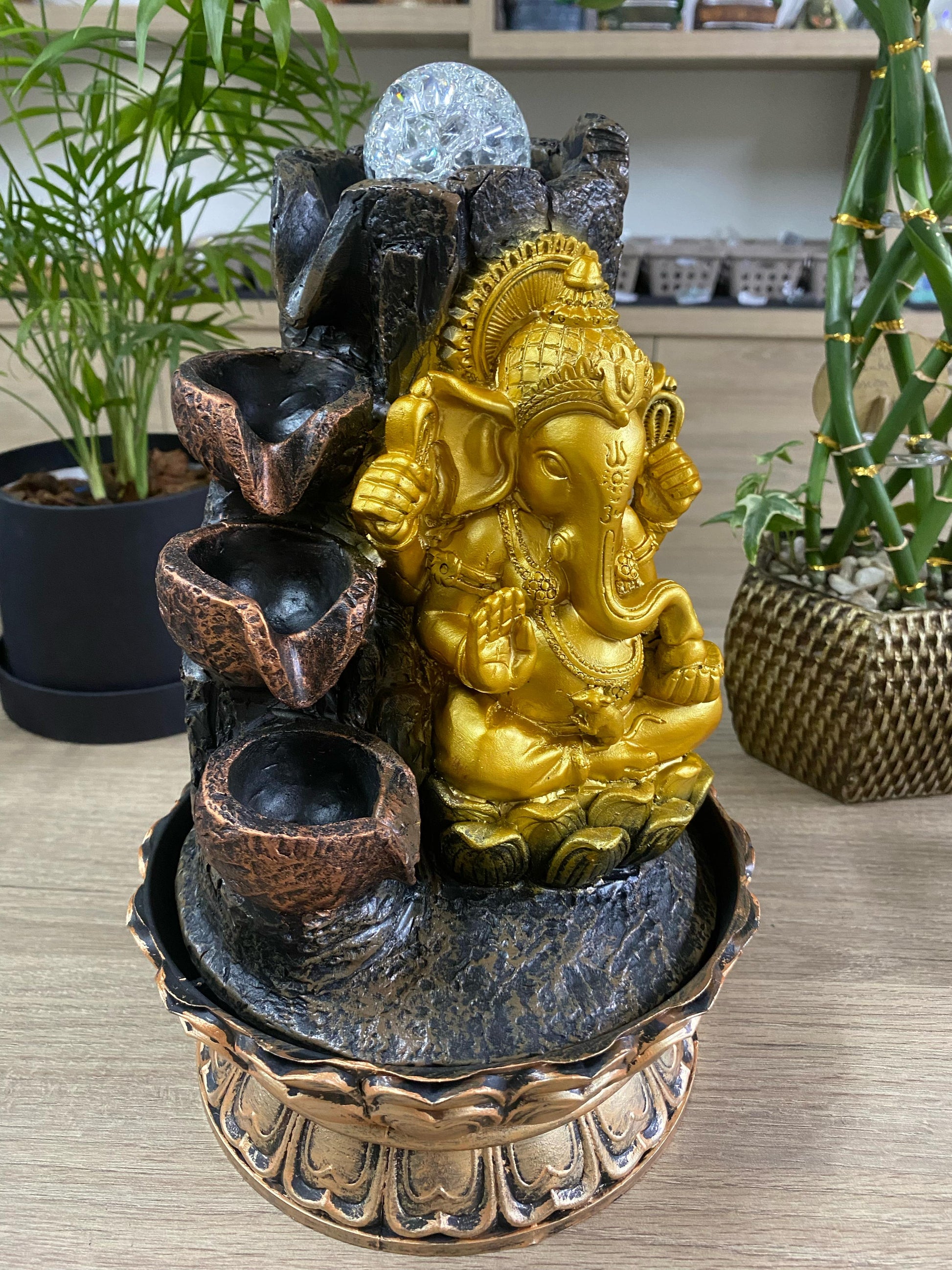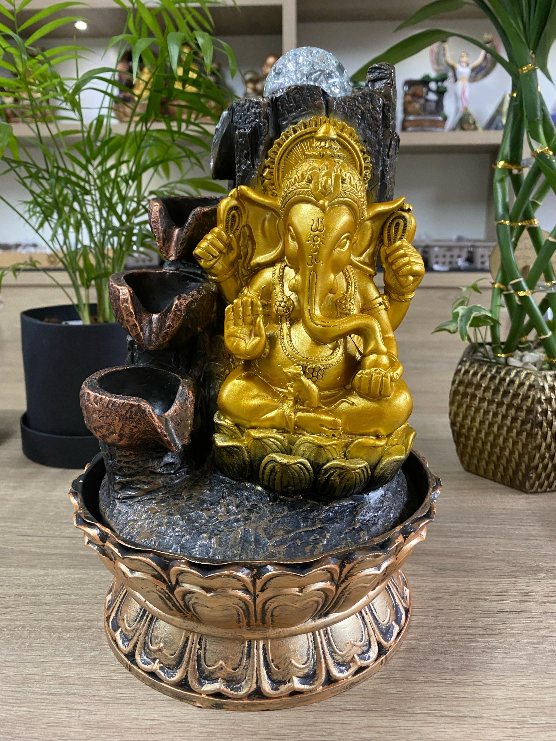 - O Ganesha, símbolo de sabedoria e removedor de obstáculos, está habilmente esculpido na fonte, proporcionando uma conexão espiritual e energética.