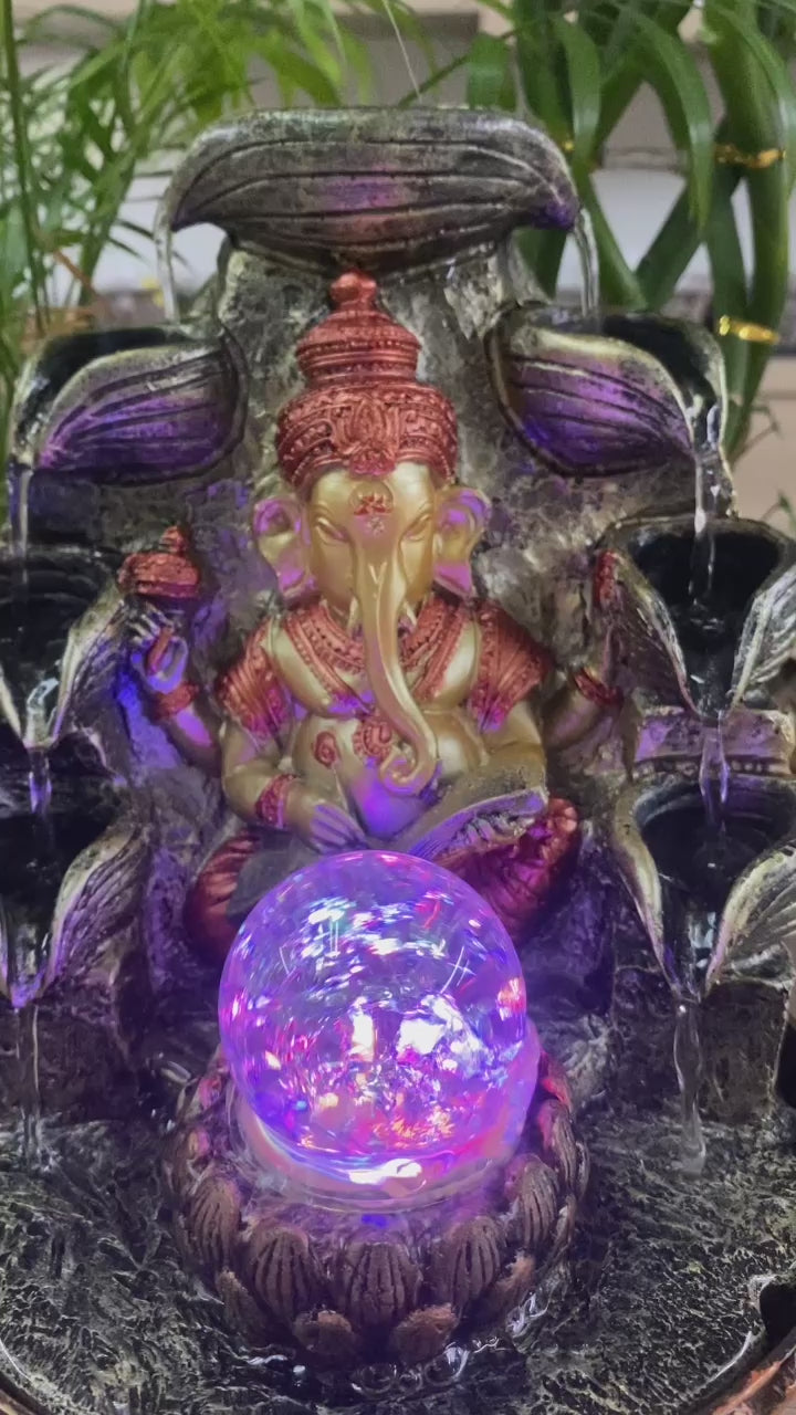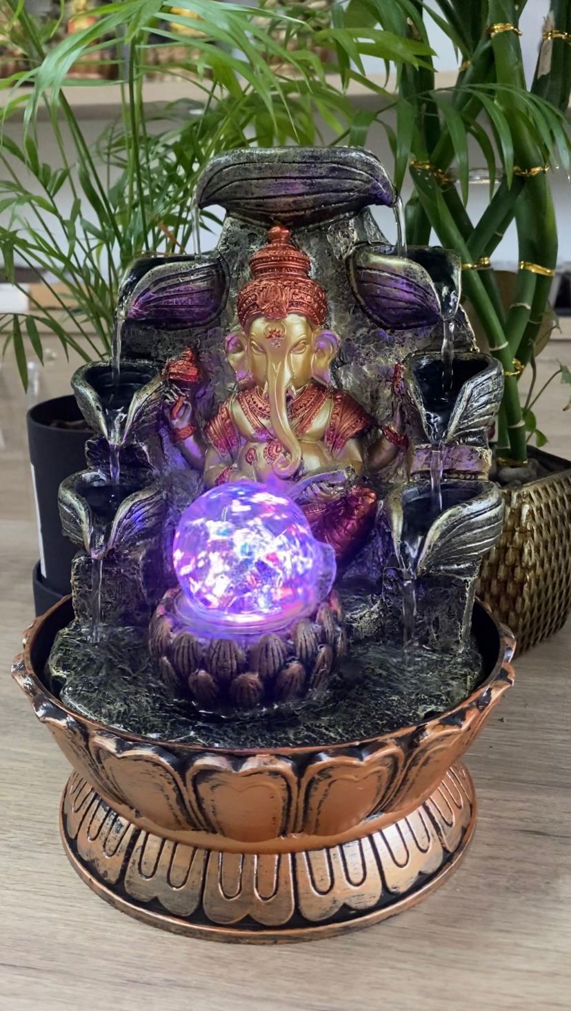 - O Ganesha, símbolo de sabedoria e removedor de obstáculos, está habilmente esculpido na fonte, proporcionando uma conexão espiritual e energética.