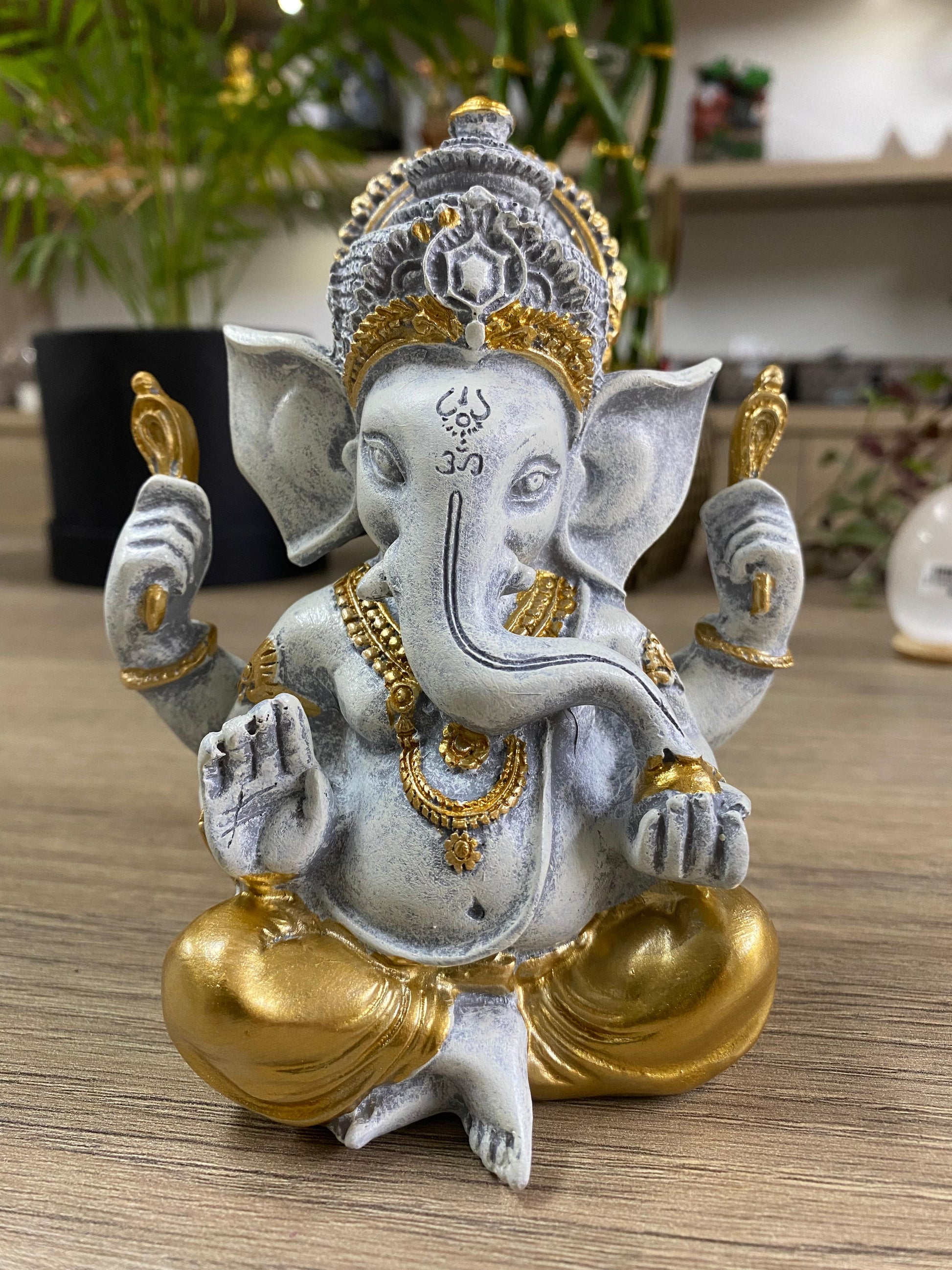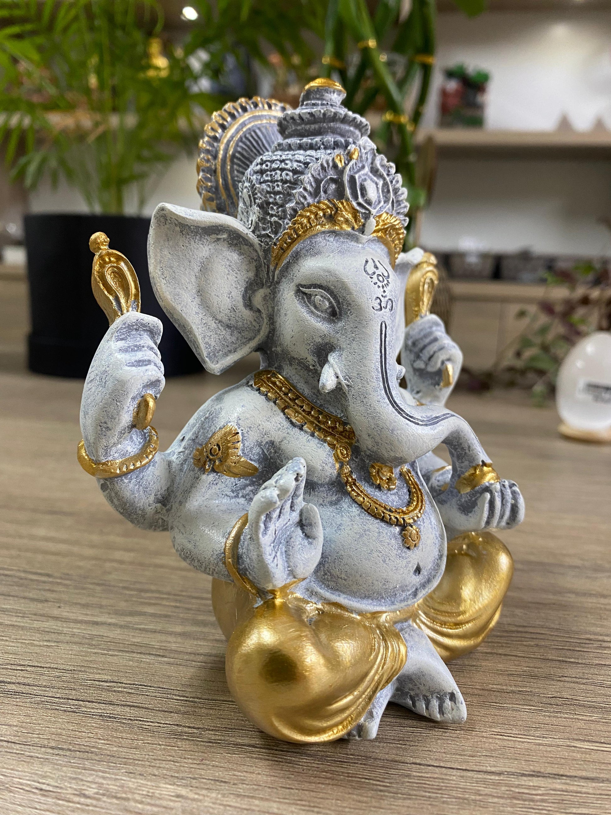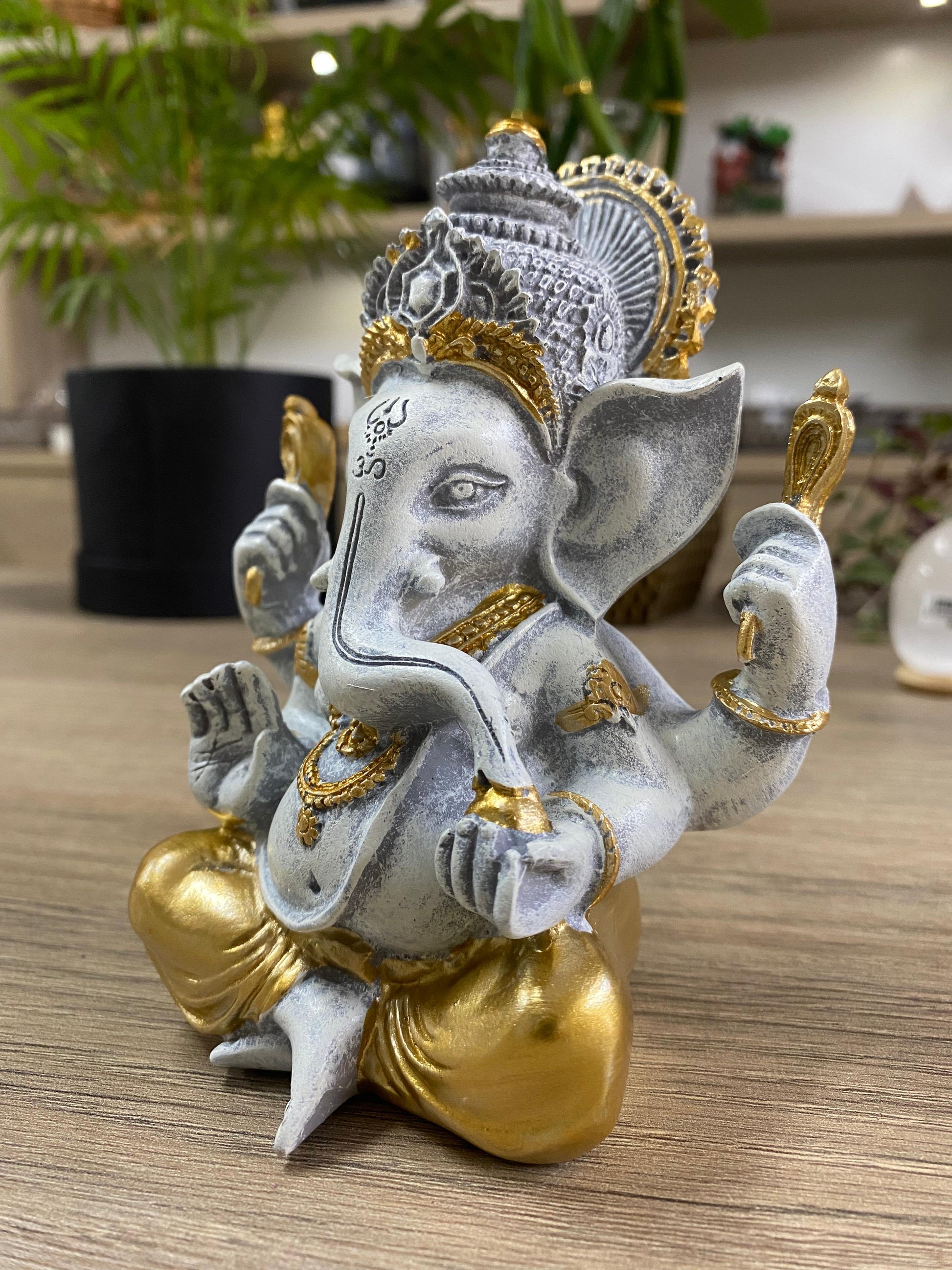 Incorpore a energia positiva e a elegância do Ganesha cinza com dourado ao seu espaço. Perfeito para criar um canto de meditação ou para complementar sua decoração, esta peça também é uma excelente escolha para presentear alguém especial.