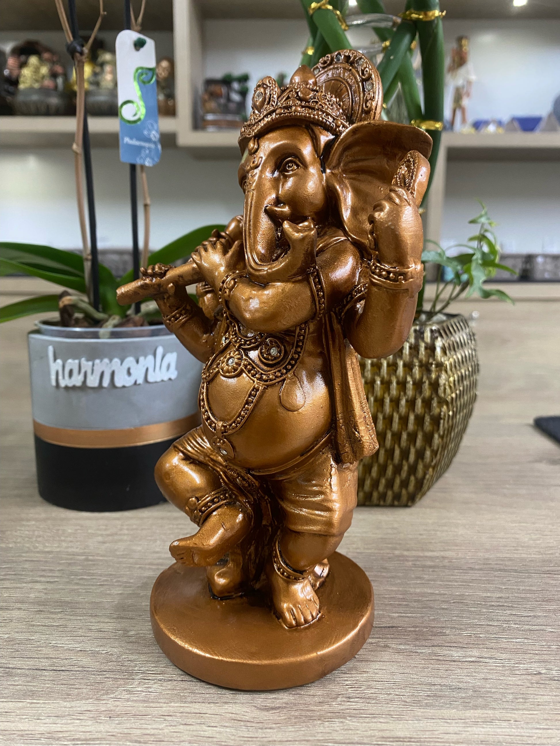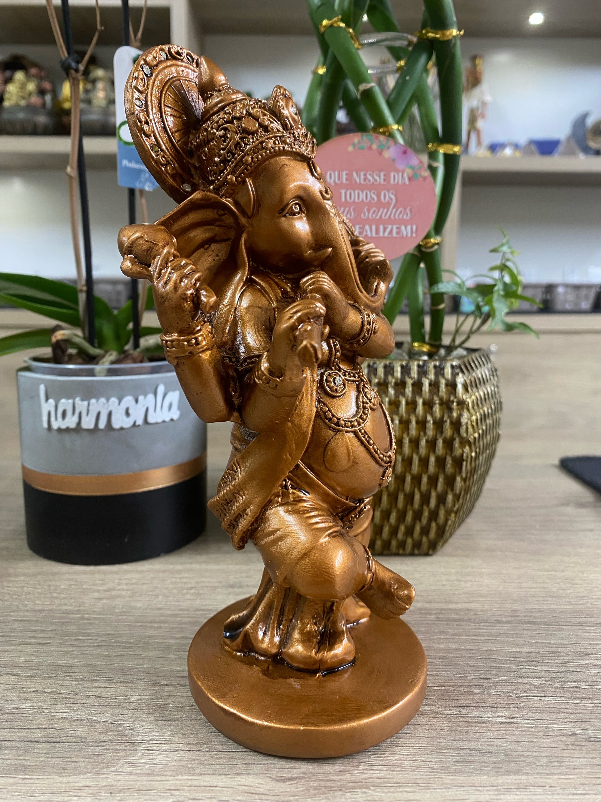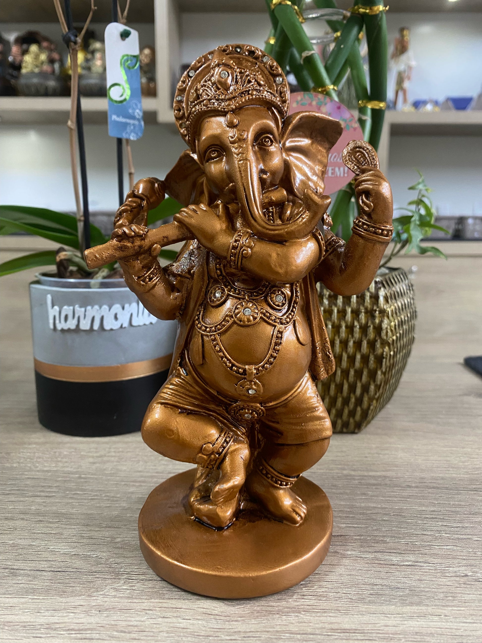 Testemunhe a dança graciosa de Ganesha, o removedor de obstáculos, com a nossa escultura meticulosamente esculpida em resina. Esta representação única do Lord Ganesha dançando traz consigo não apenas beleza estética, mas também a energia vibrante de celebração e harmonia divina.