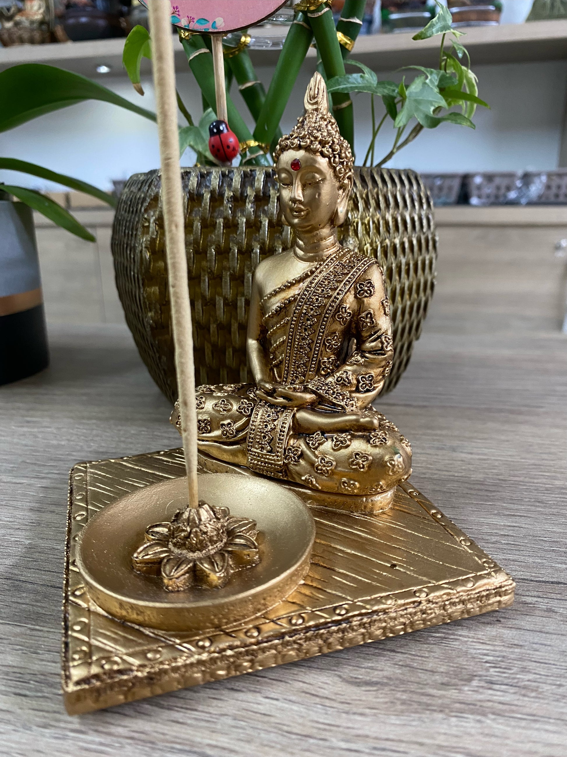 Este incensário é esculpido em resina maciça, garantindo durabilidade e detalhes refinados. A resina confere uma textura elegante, destacando cada detalhe do Buda e da flor de lótus com precisão artística.
