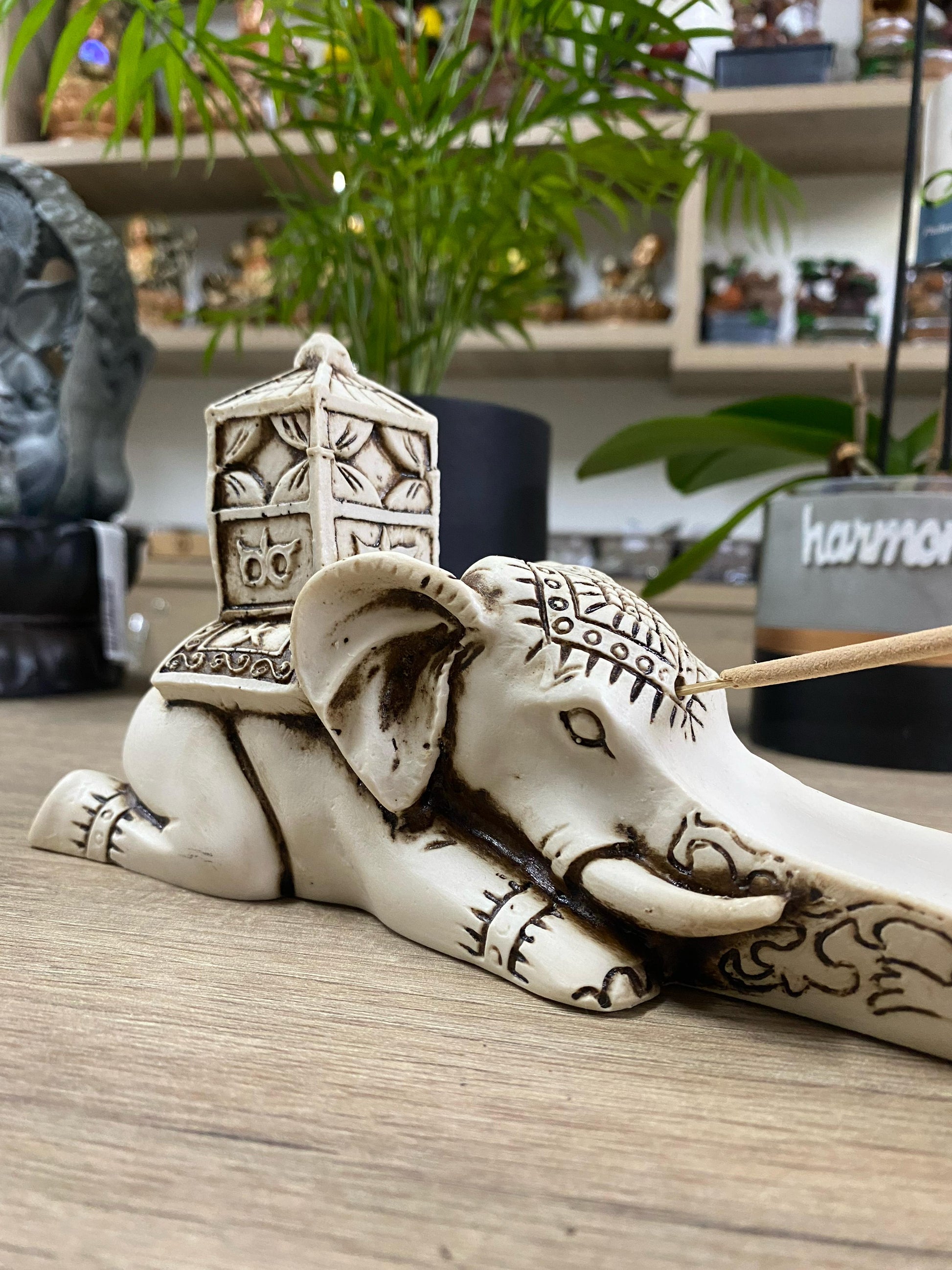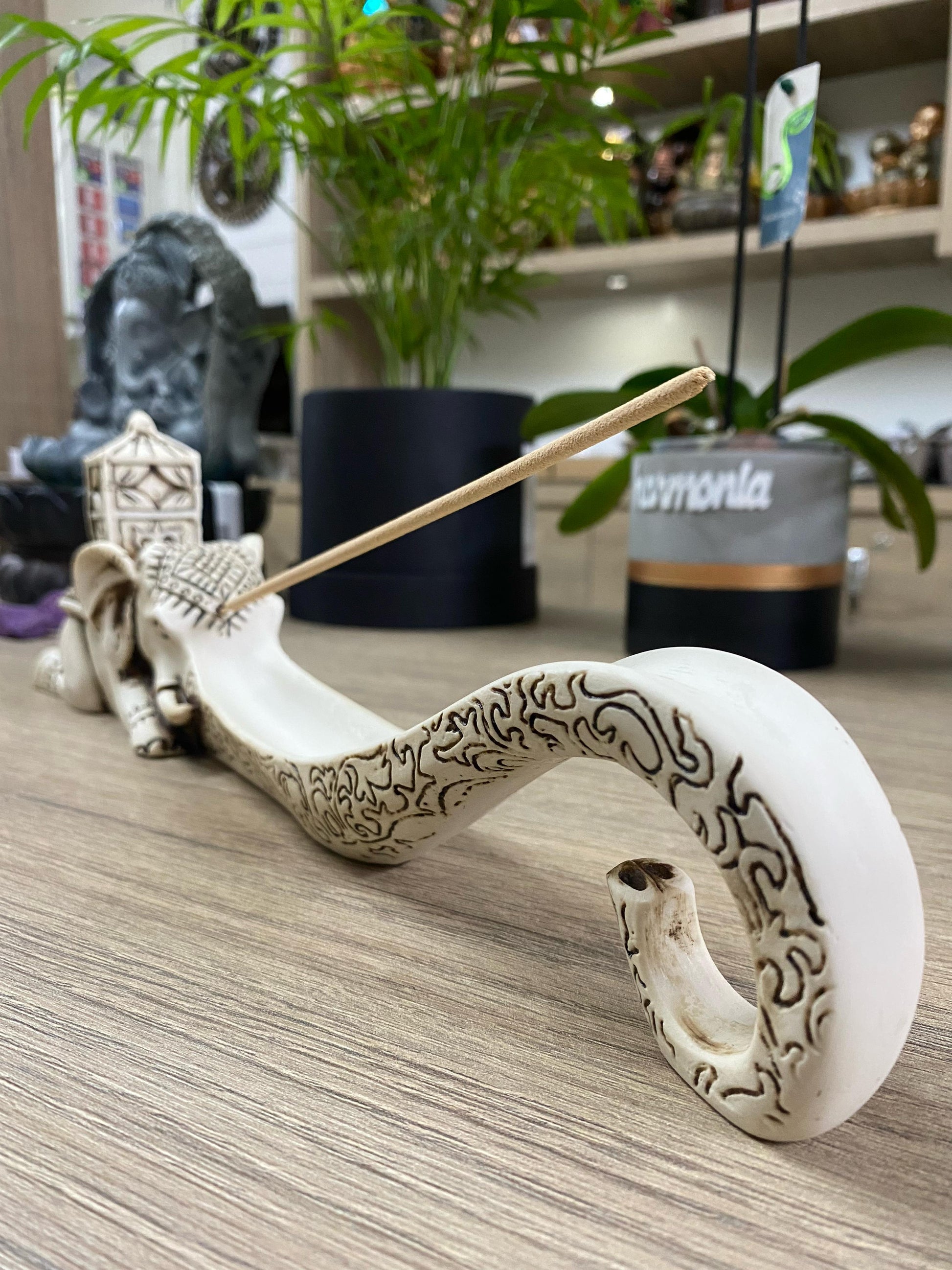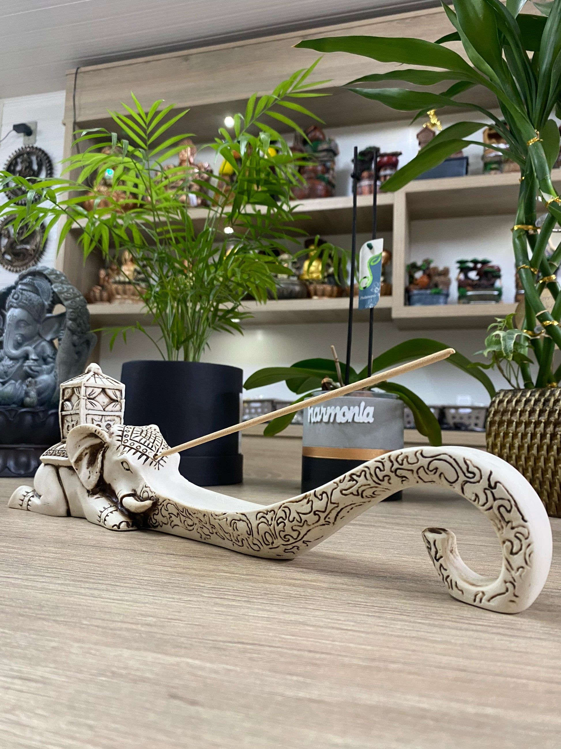 O Incensário de Elefante é uma peça encantadora esculpida em resina, incorporando a majestosa presença e simbolismo positivo desses magníficos animais. Além de ser um suporte funcional para incensos, este incensário acrescenta um toque distintivo à sua decoração, emanando uma atmosfera de boa sorte e serenidade.