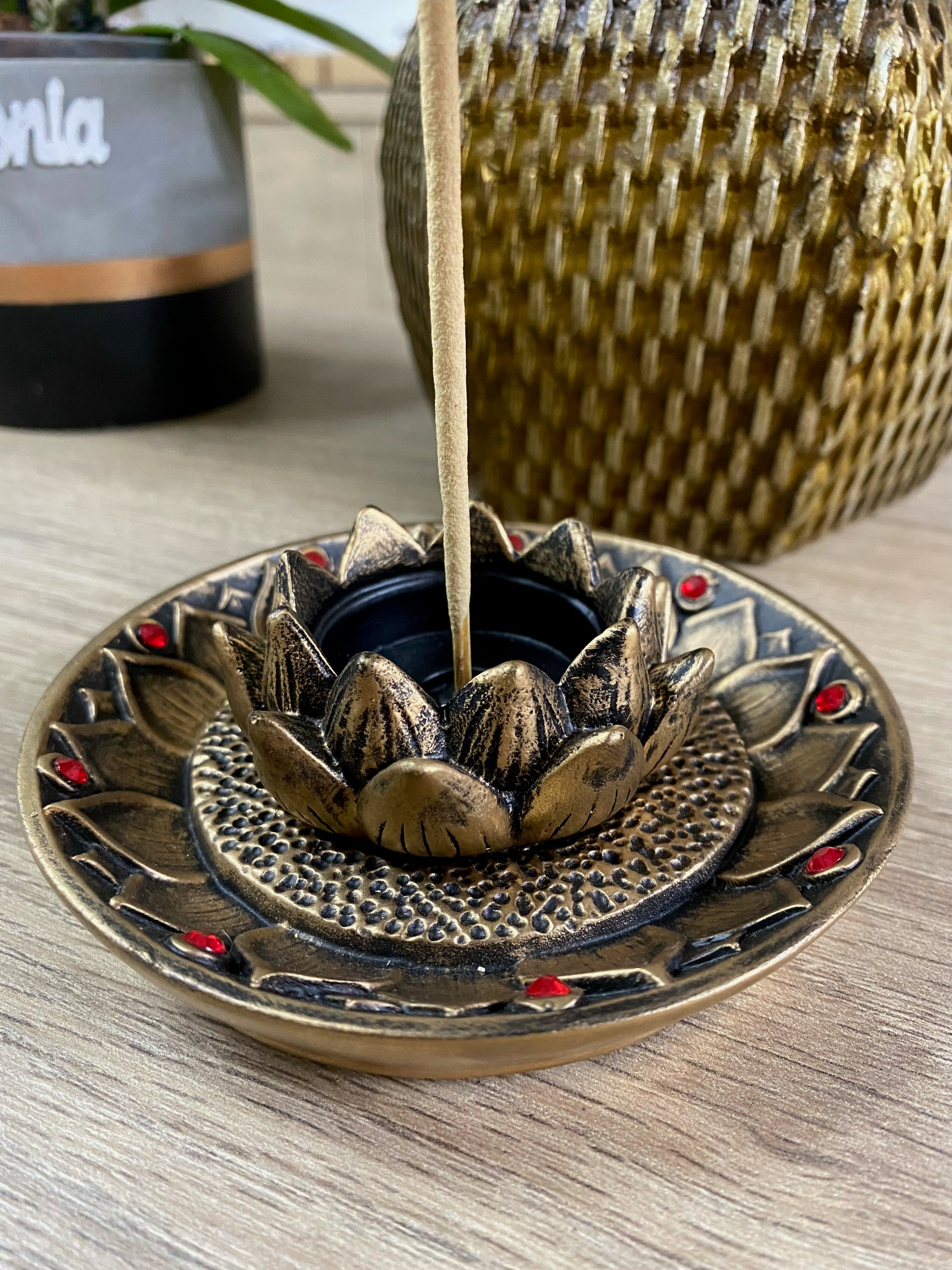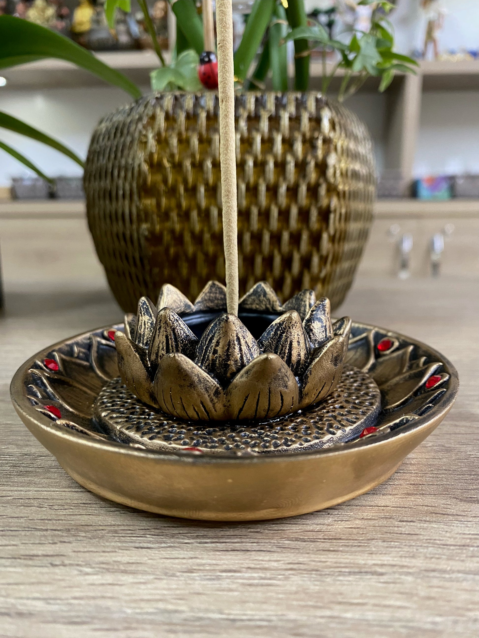 Incensário de Resina Prato - Flor de Lótus Preto/Dourado