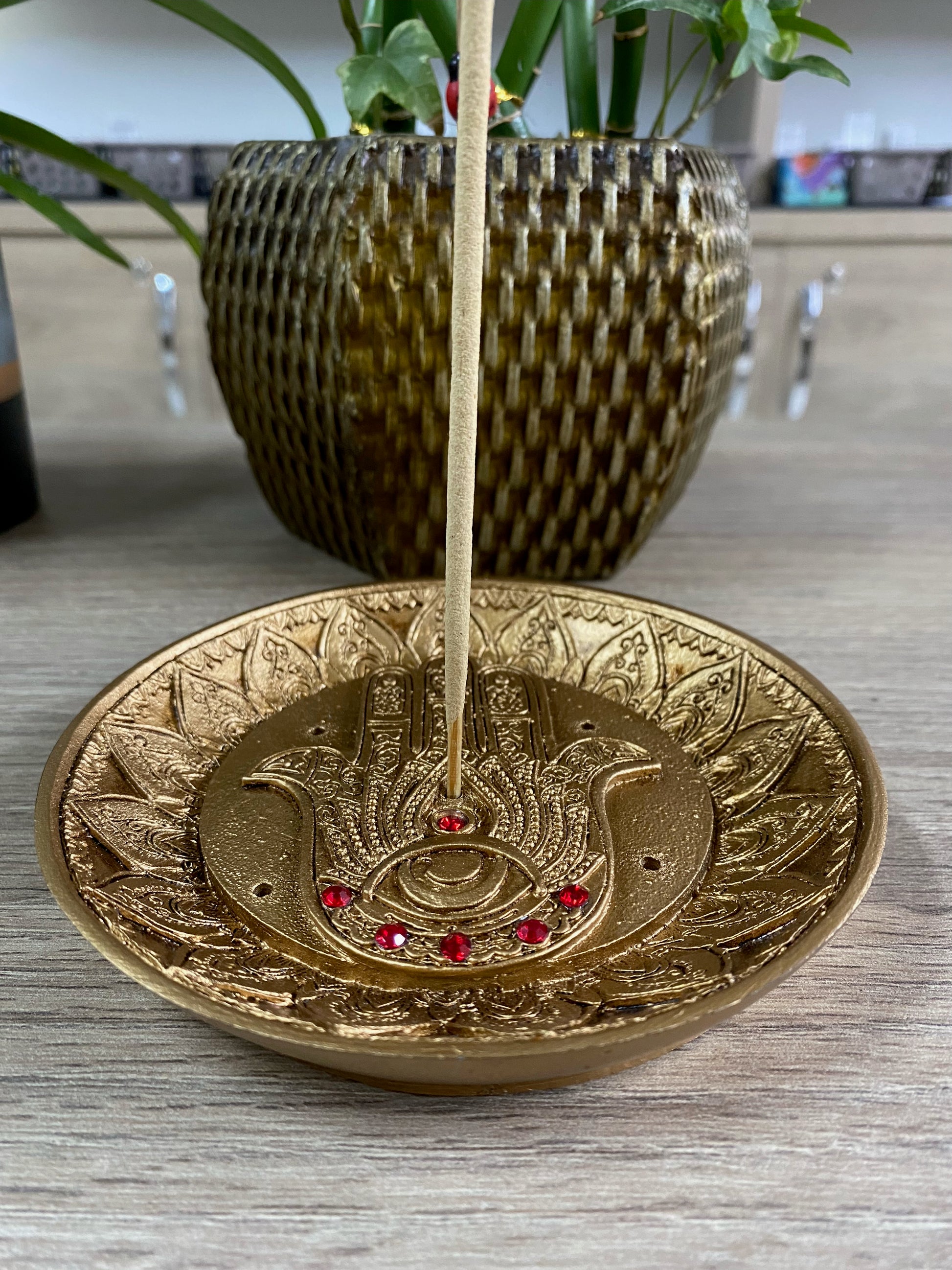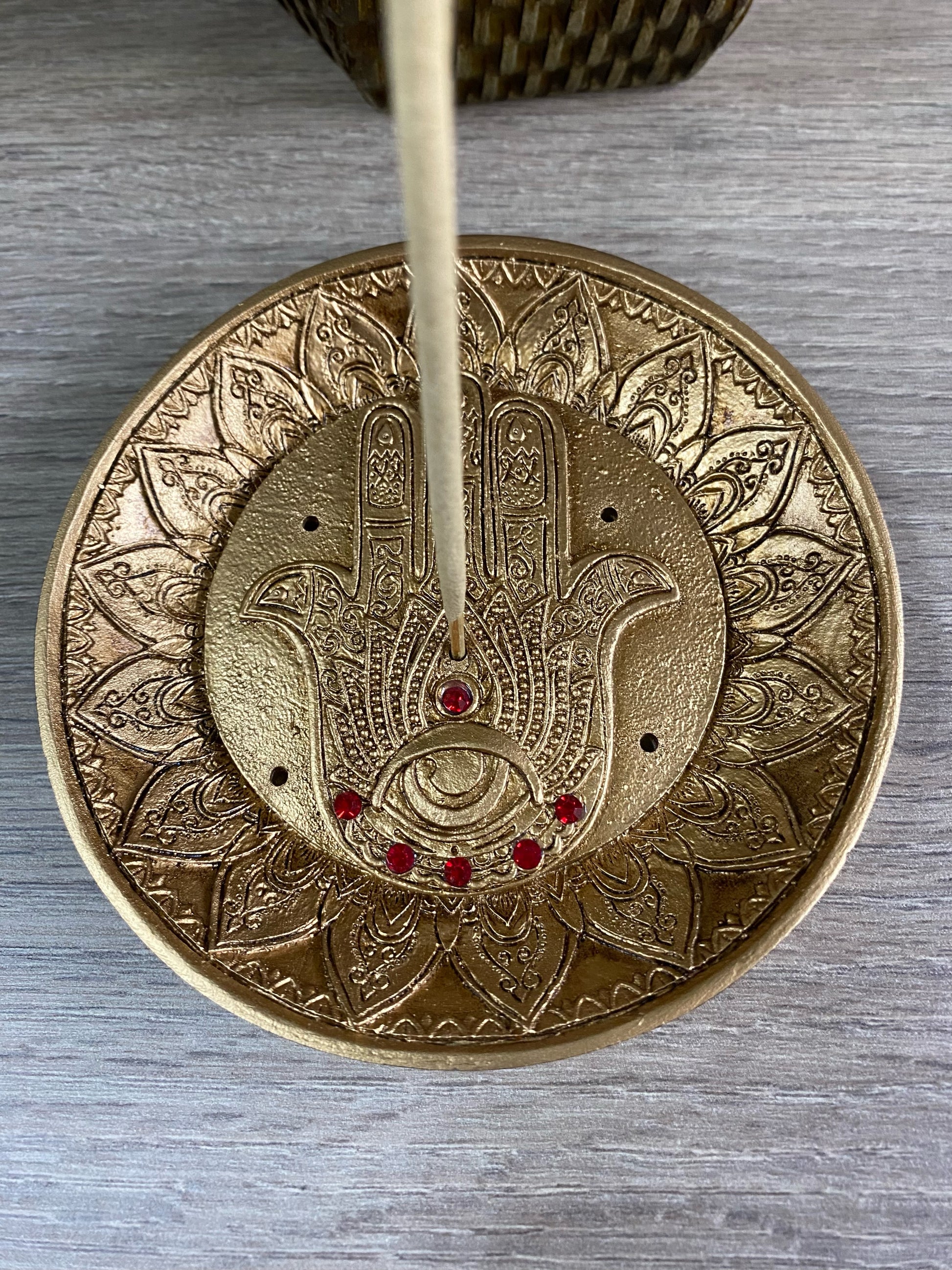 Desperte uma atmosfera espiritual em seu espaço com nosso Incensário de Resina Estilo Prato, agora apresentando a simbologia da Hamsa.
