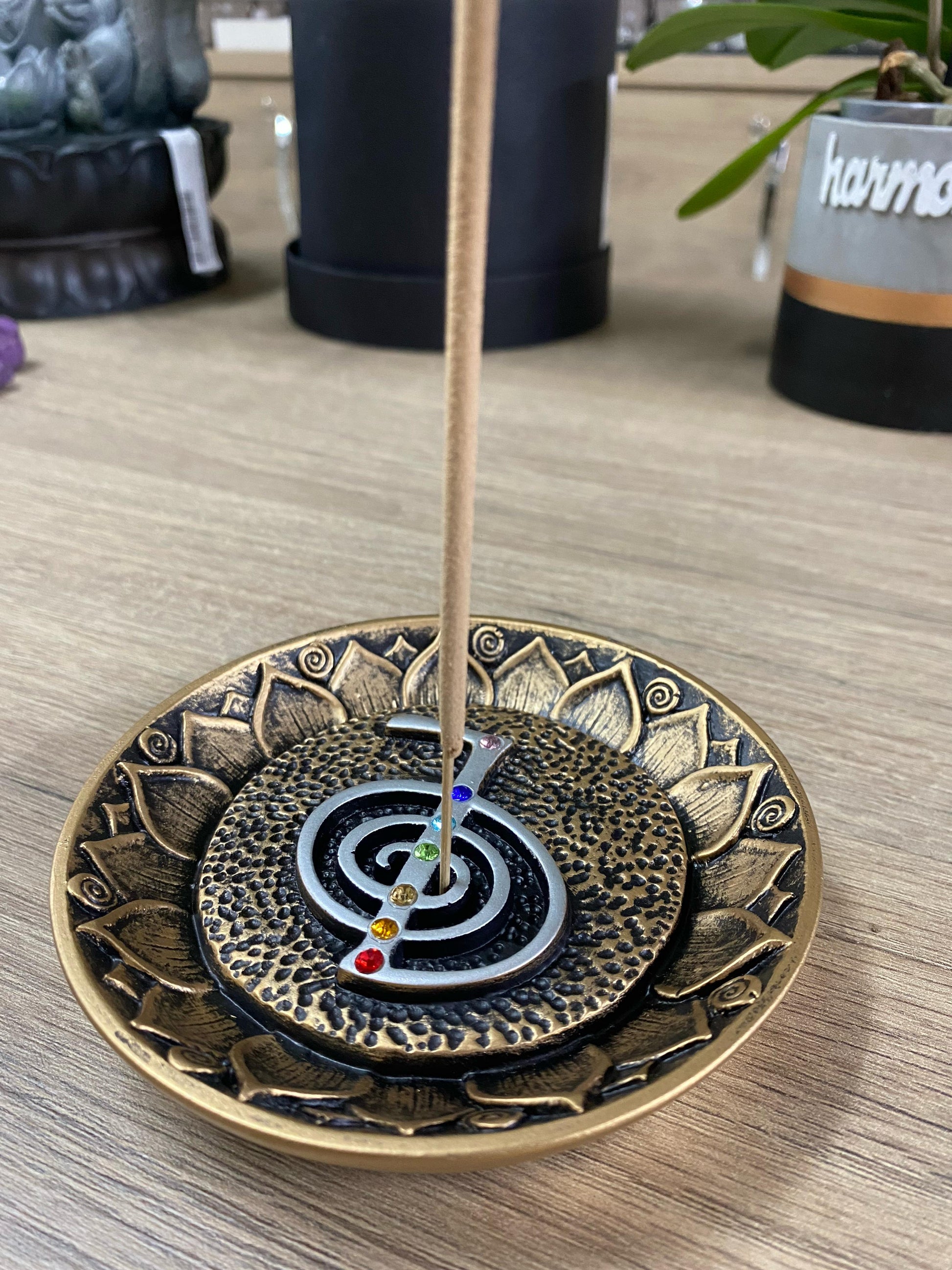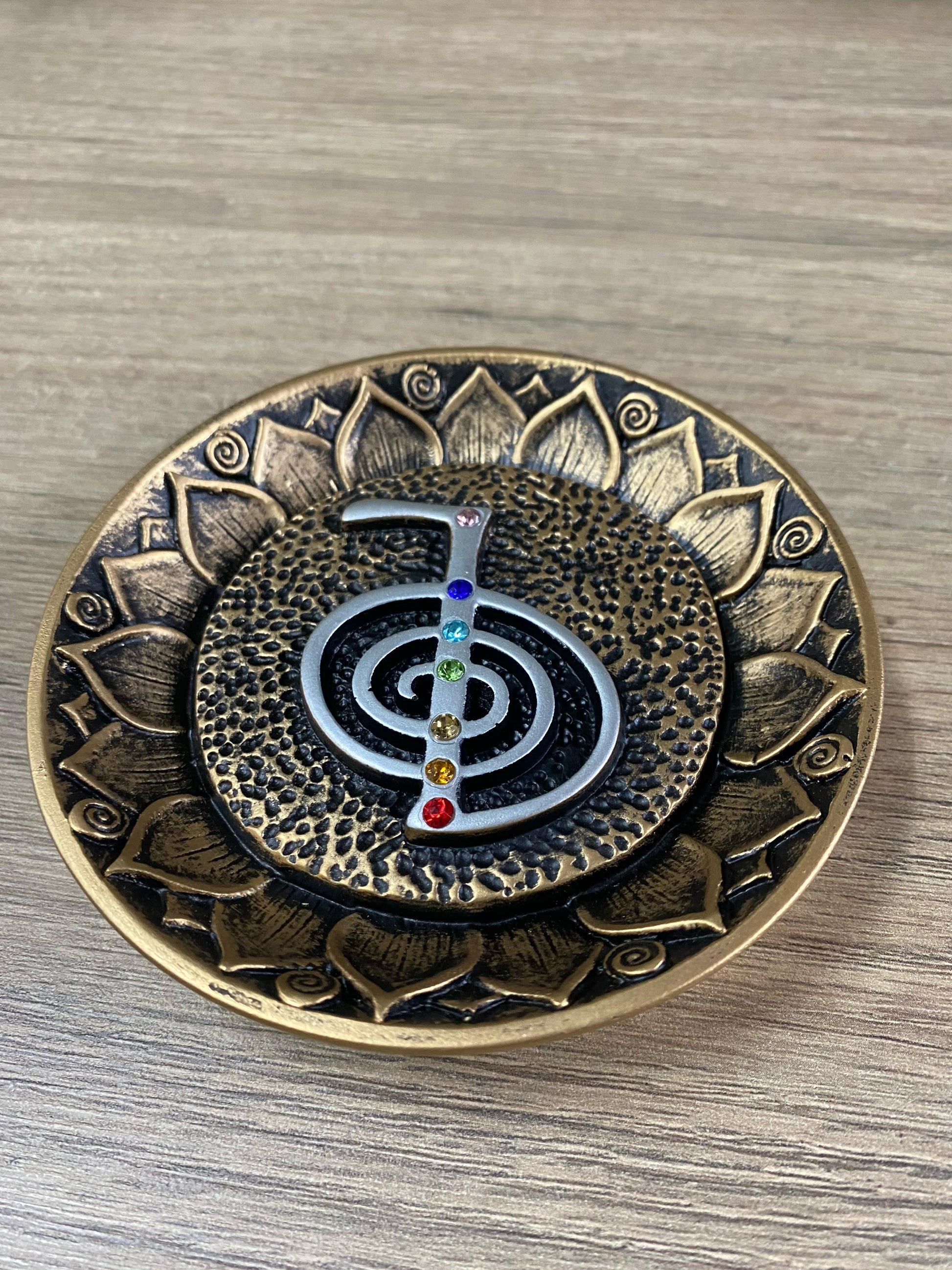 O Incensário Prato com o símbolo CHO KO REI e strass dos 7 Chakras é mais do que um suporte para incensos; é uma expressão de harmonia energética e equilíbrio espiritual. Com um design elegante em resina, esta peça proporciona uma atmosfera acolhedora e inspiradora ao seu espaço.