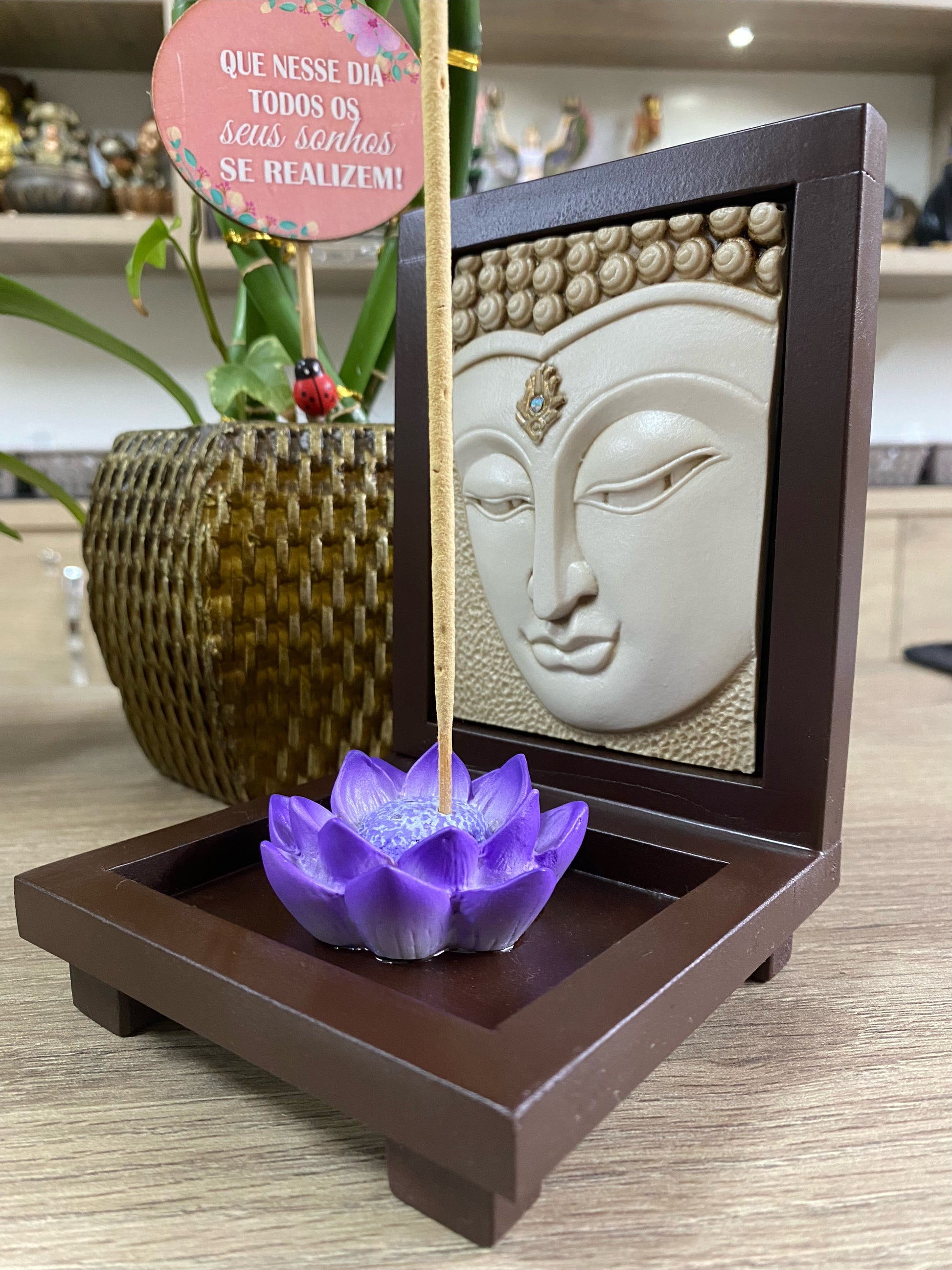 Este incensário é esculpido em resina maciça, garantindo durabilidade e detalhes refinados. A resina confere uma textura elegante, destacando cada detalhe do Buda e da flor de lótus com precisão artística.