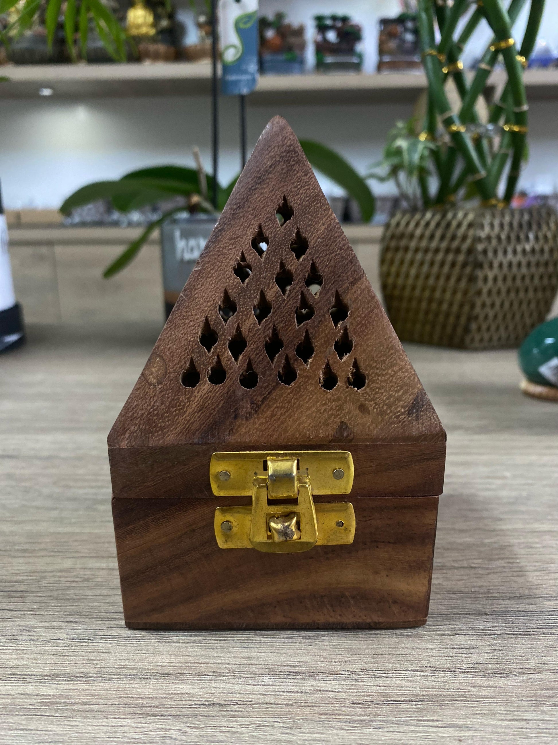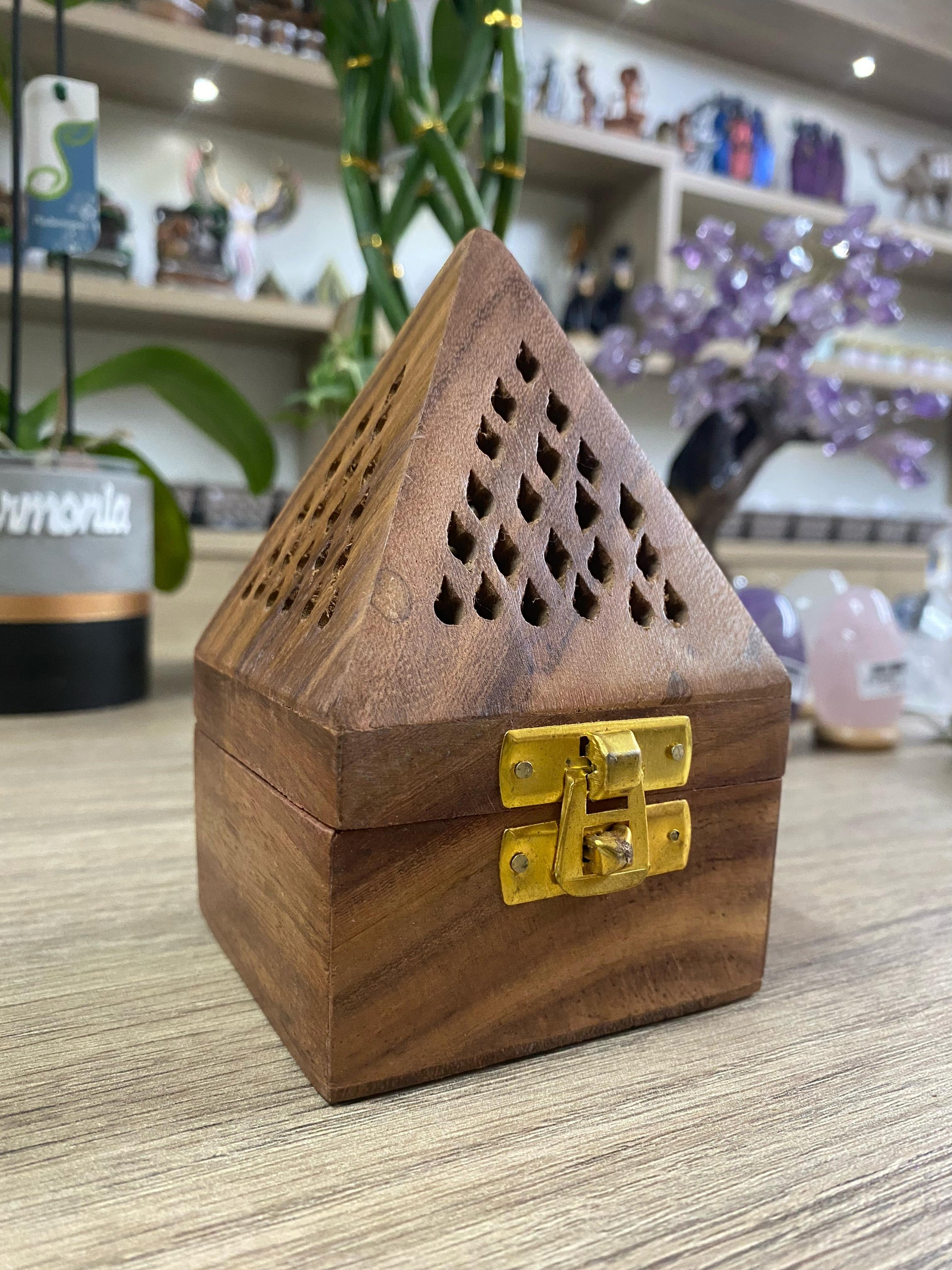 Adicione um toque de mistério e espiritualidade ao seu espaço com nosso Incensário Piramidal feito de Madeira Suar de Bali. Projetado para bombitas ou pastilhas de defumação, este incensário não apenas oferece uma experiência aromática única, mas também serve como uma peça decorativa encantadora.