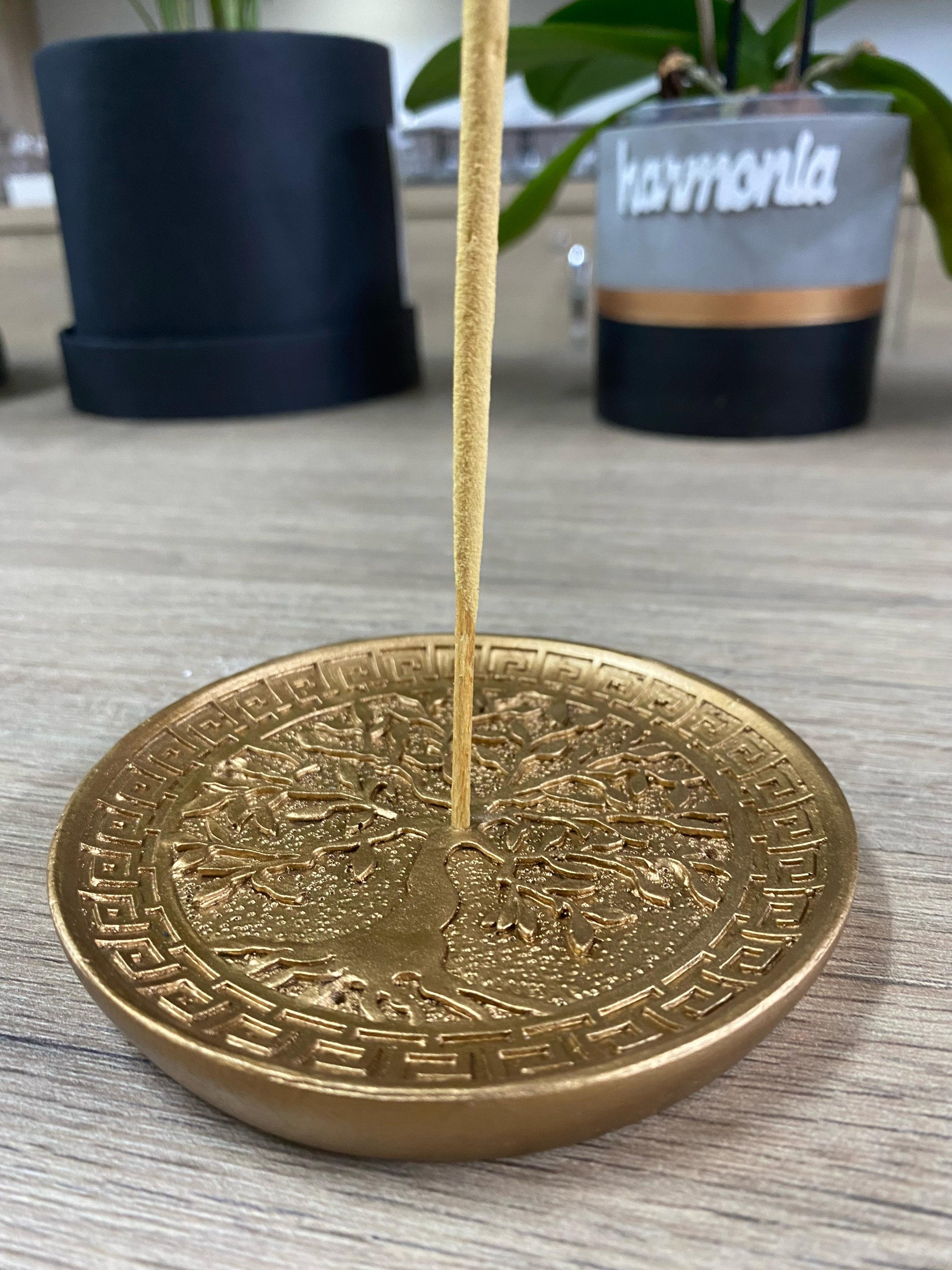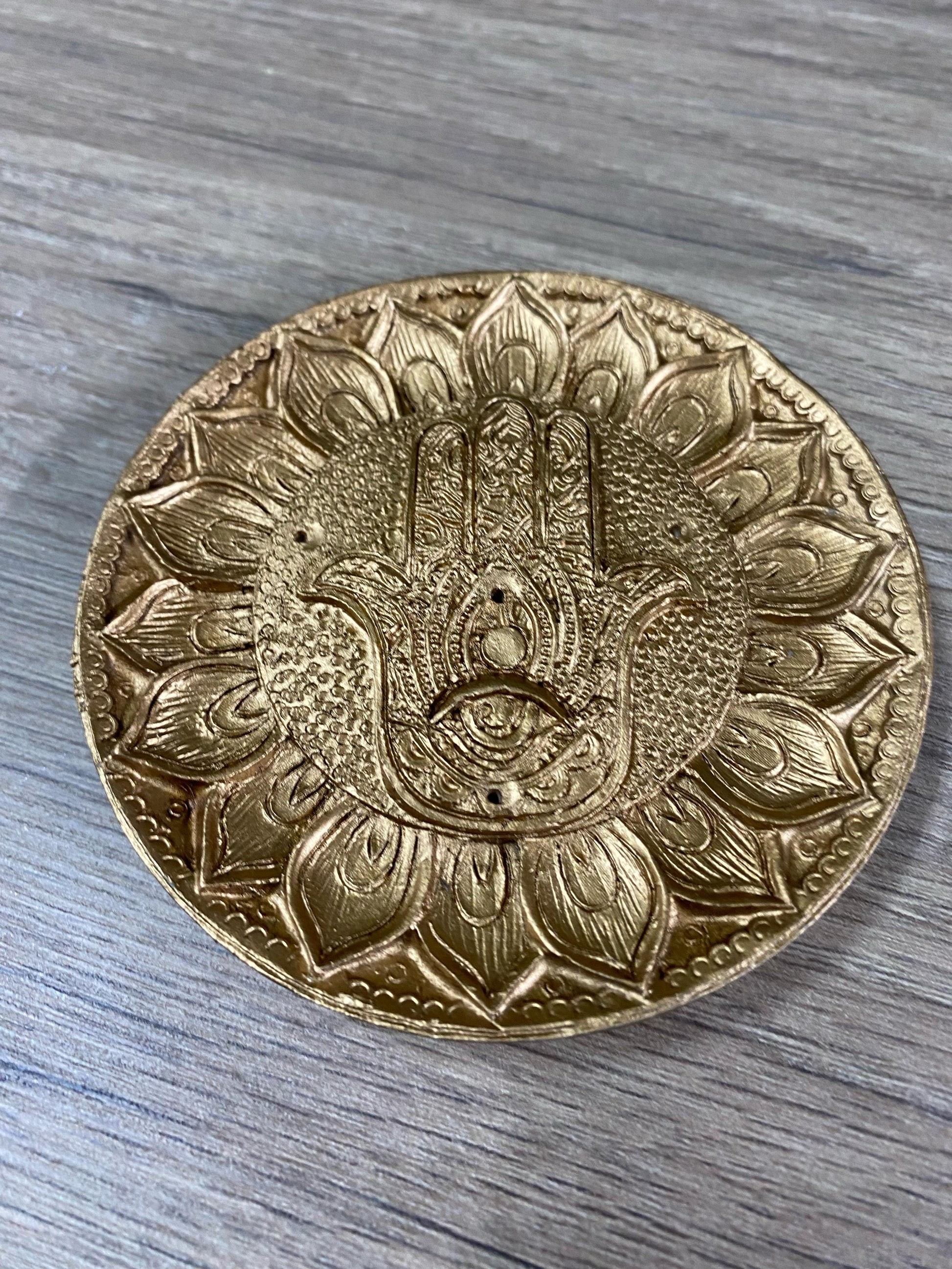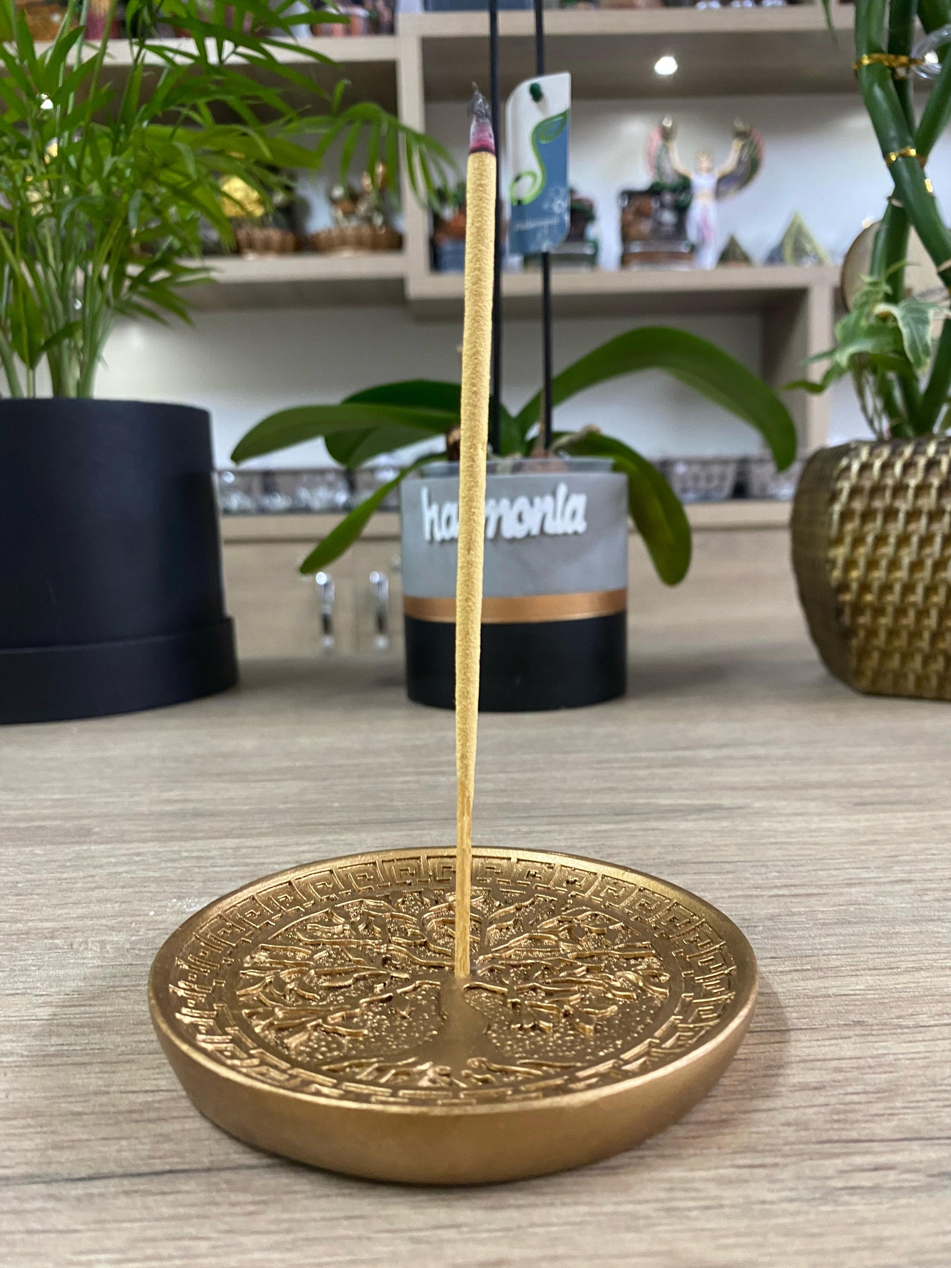 Os Incensários Prato Dourado são peças requintadas em resina, cada uma medindo 9,5 cm de diâmetro. Cada modelo apresenta uma representação simbólica única, adicionando significado e estilo à sua experiência de queimar incensos.
