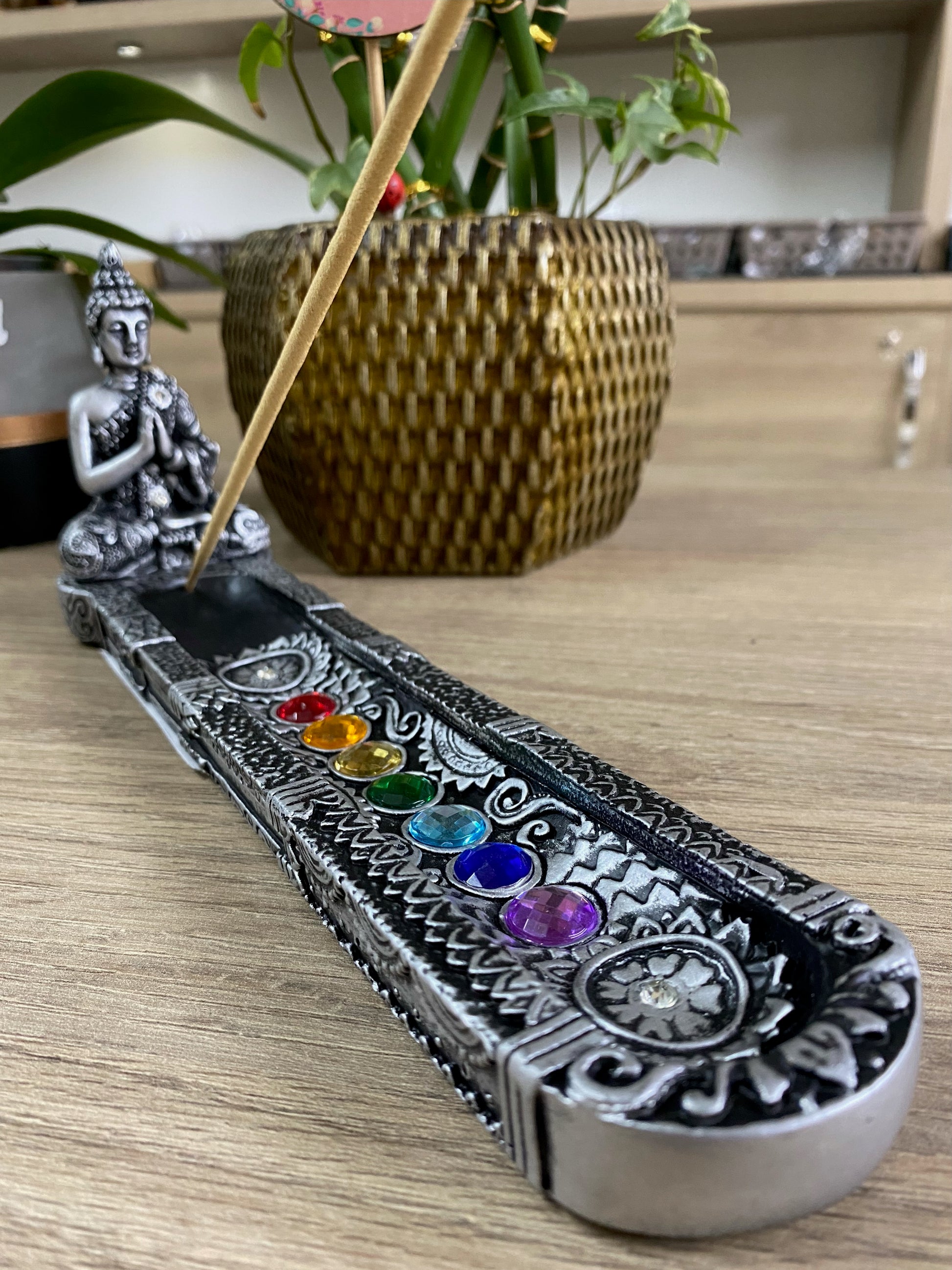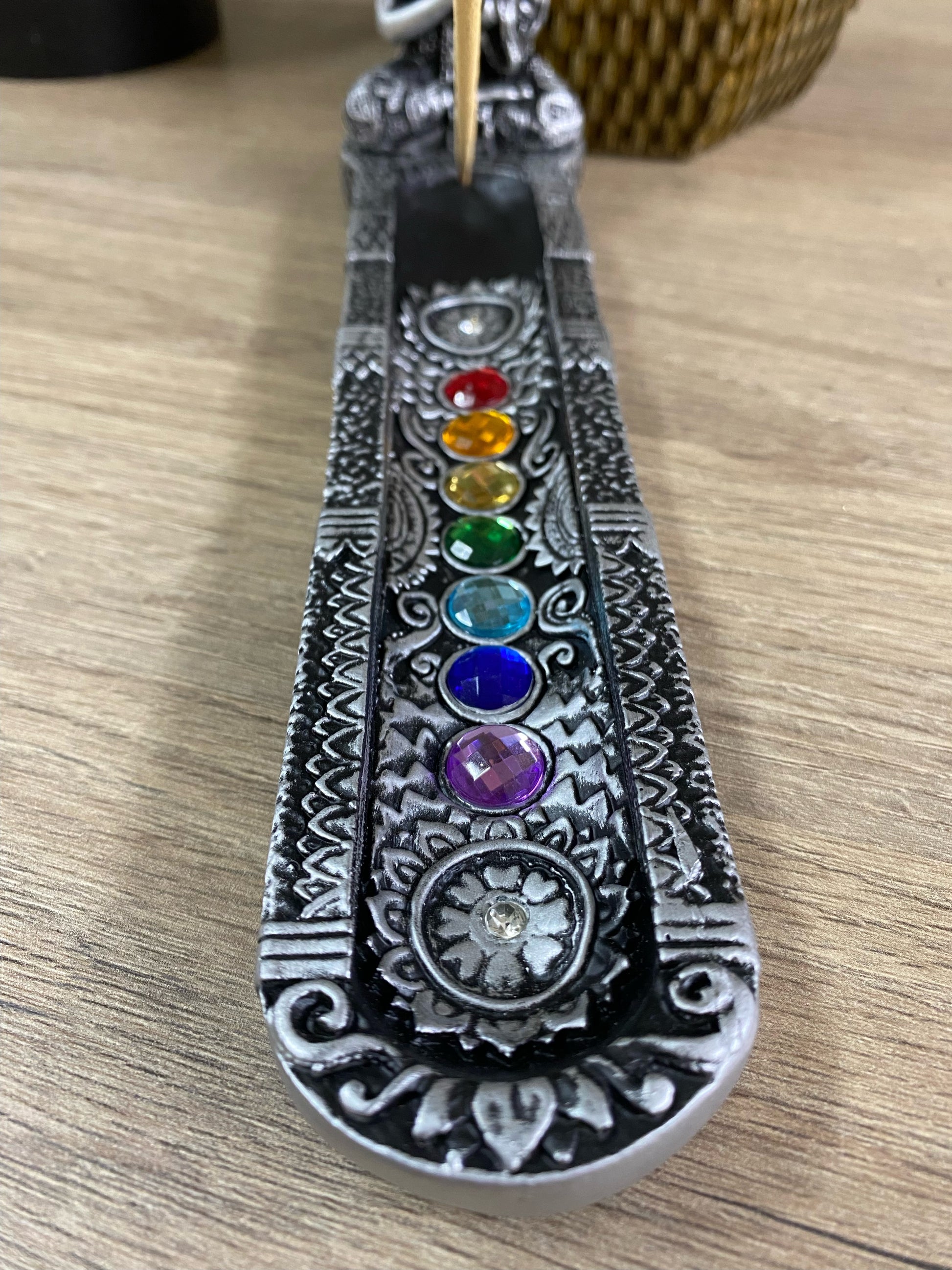 Incensário Régua de Resina - Buda e 7 Chakras Preto/Prata