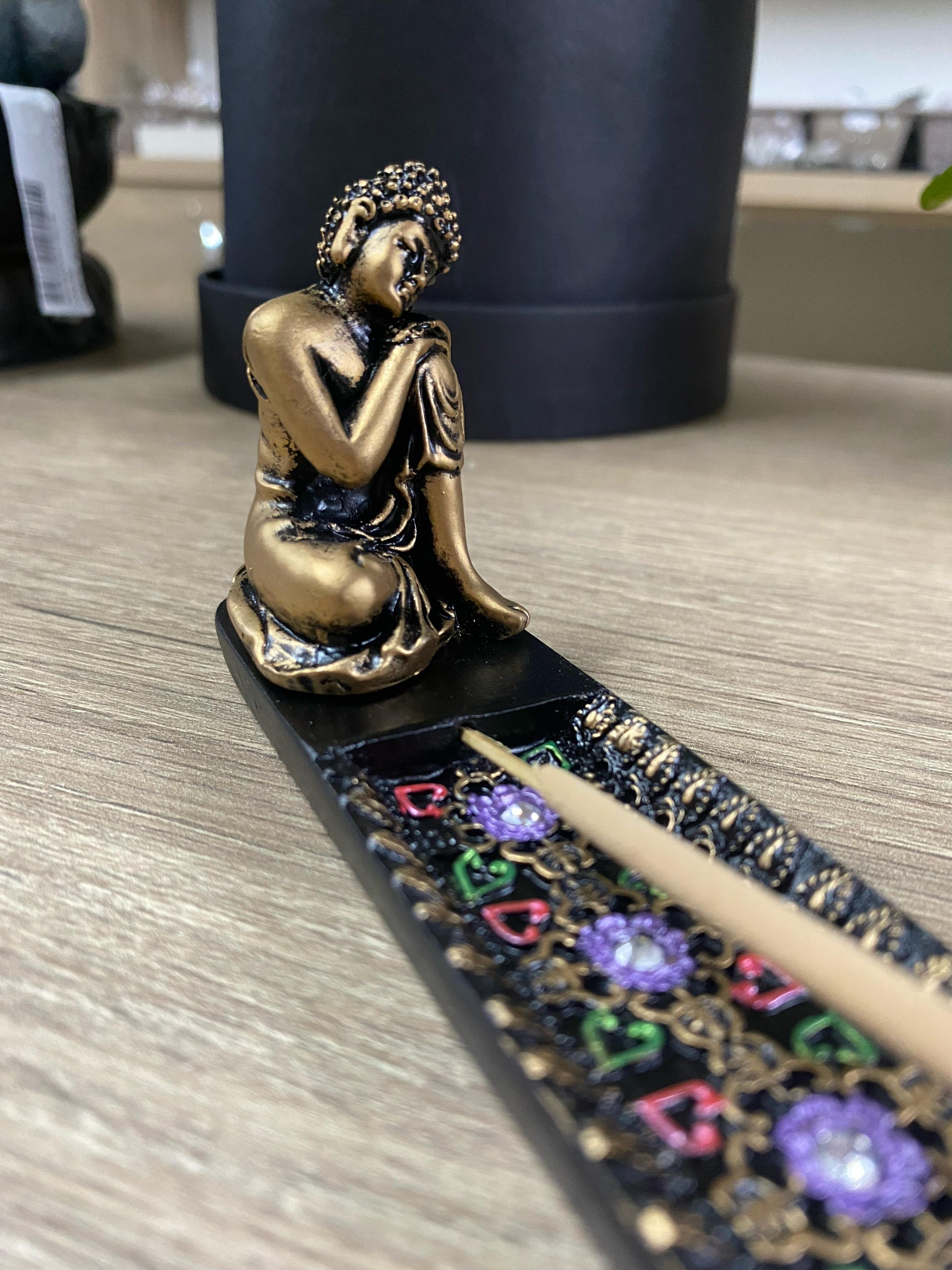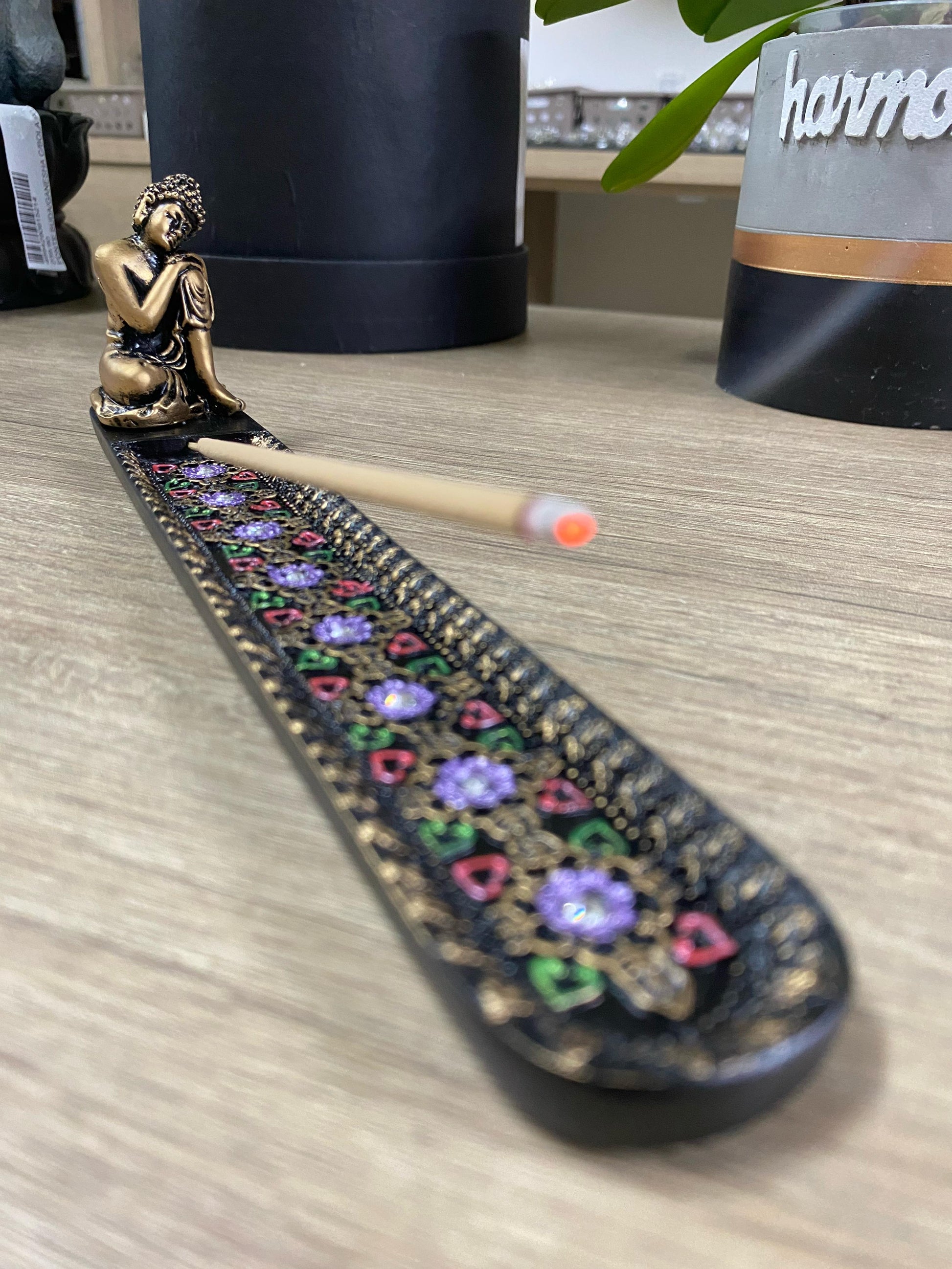 Eleve a experiência de queimar incenso para um nível mais refinado com o Incensário de Resina adornado com strass e apresentando a serenidade do Buda. Esta peça não apenas serve como suporte funcional para seus incensos favoritos, mas também acrescenta um toque de elegância ao seu espaço.