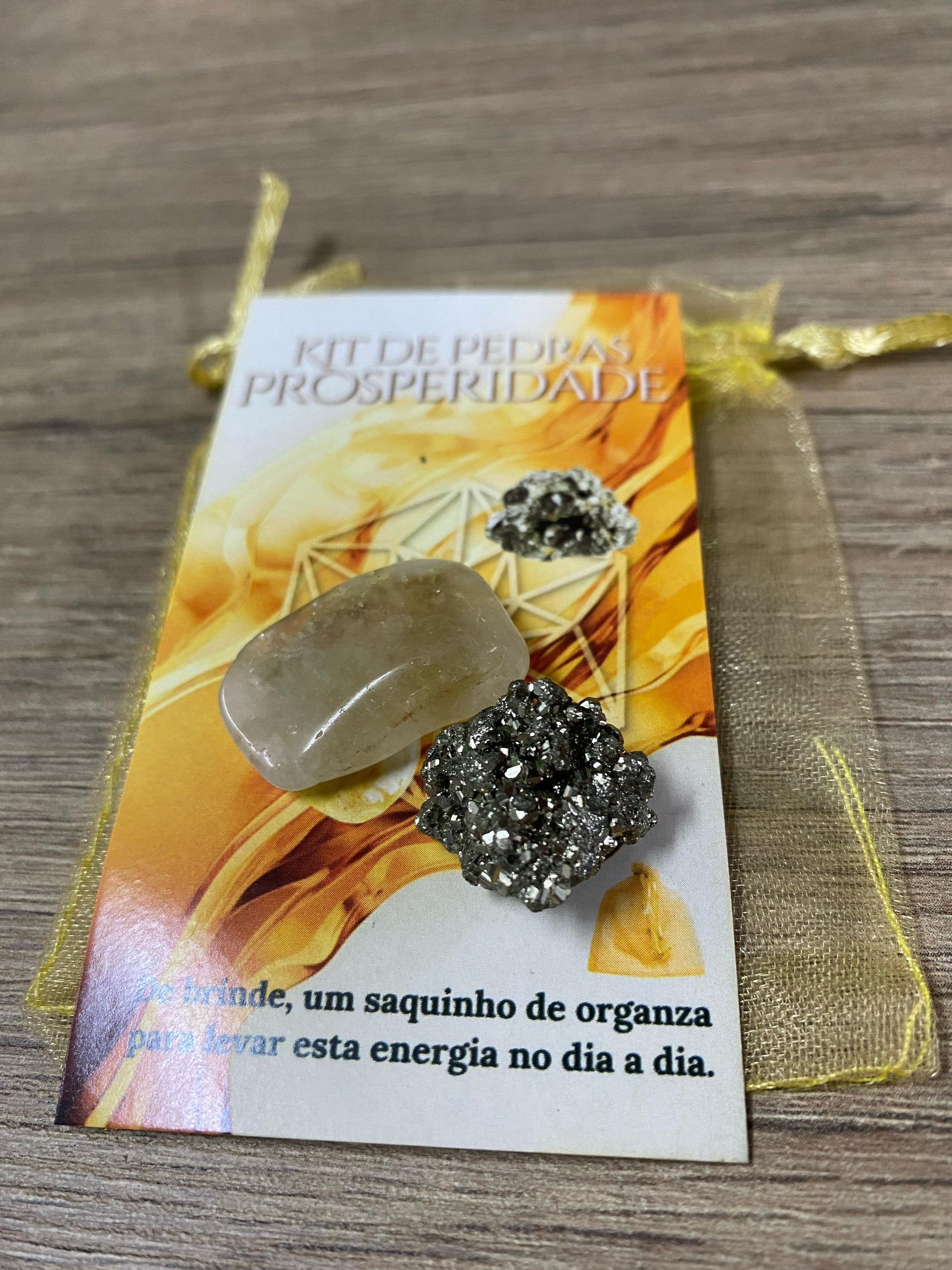 O Kit Prosperidade inclui uma Pirita e um Citrino, cada pedra medindo de 1 a 2cm. Cada pedra é única, apresentando variações naturais de cor e forma.